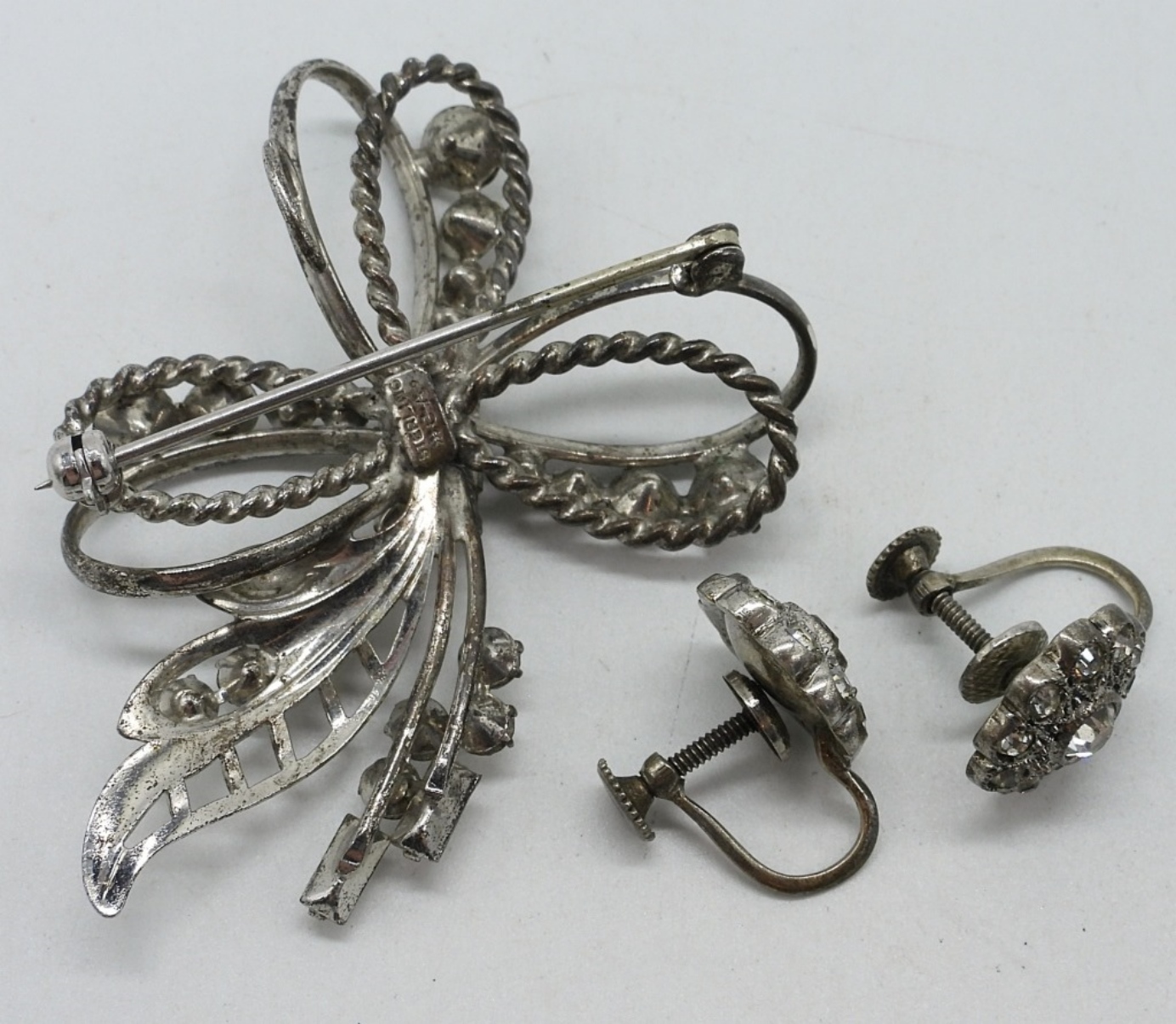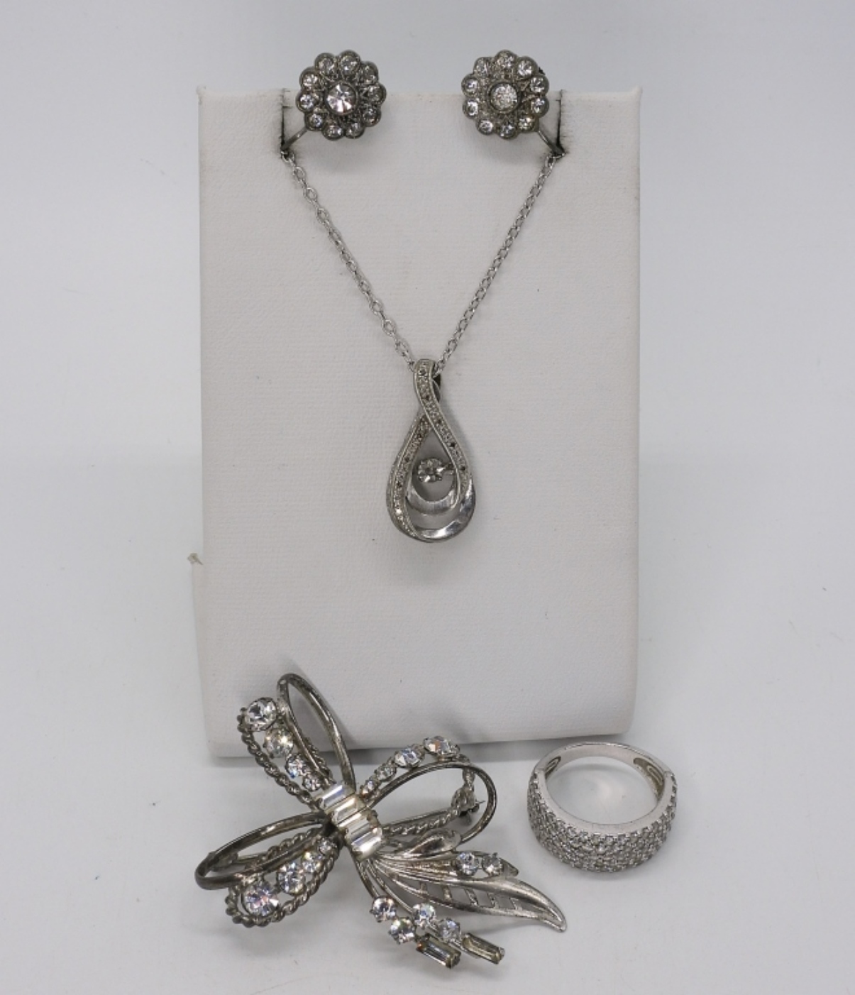 Vintage sterling white rhinestone brooch / pendant, 2″ long. Vintage rhinestone screw back earrings. Modern simulated diamond 925 necklace (18″) and ring (sz 5). (13 dwt)