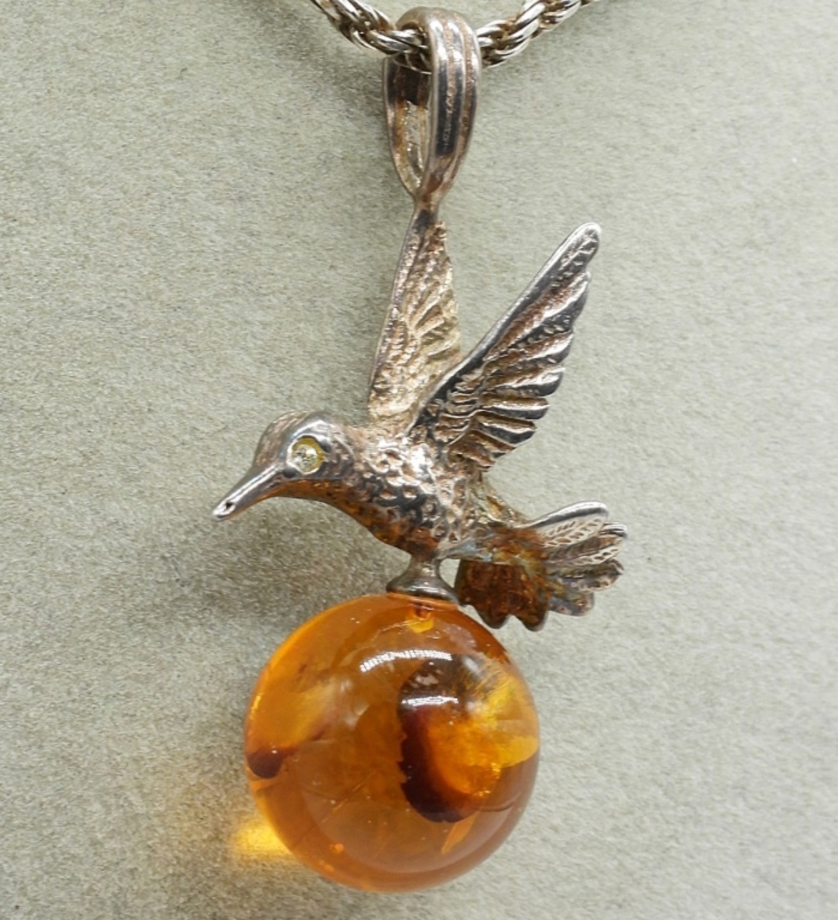 Hummingbird on Amber sterling pendant, 2″ long. On a sterling 24″ long chain. (8.1 dwt)