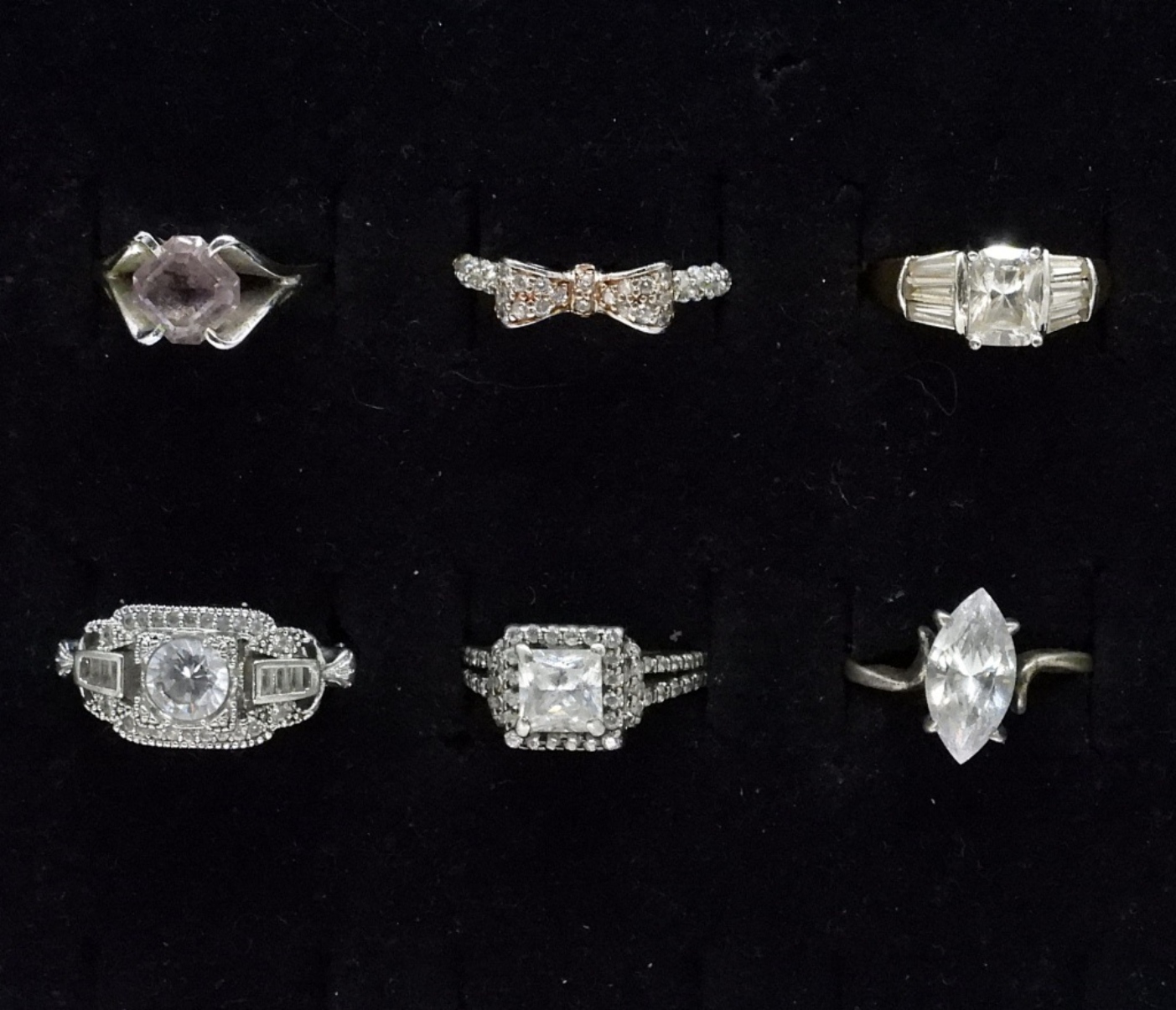 Six sterling rings with simulated diamond gemstones. Sizes 5-7. (11 dwt)
