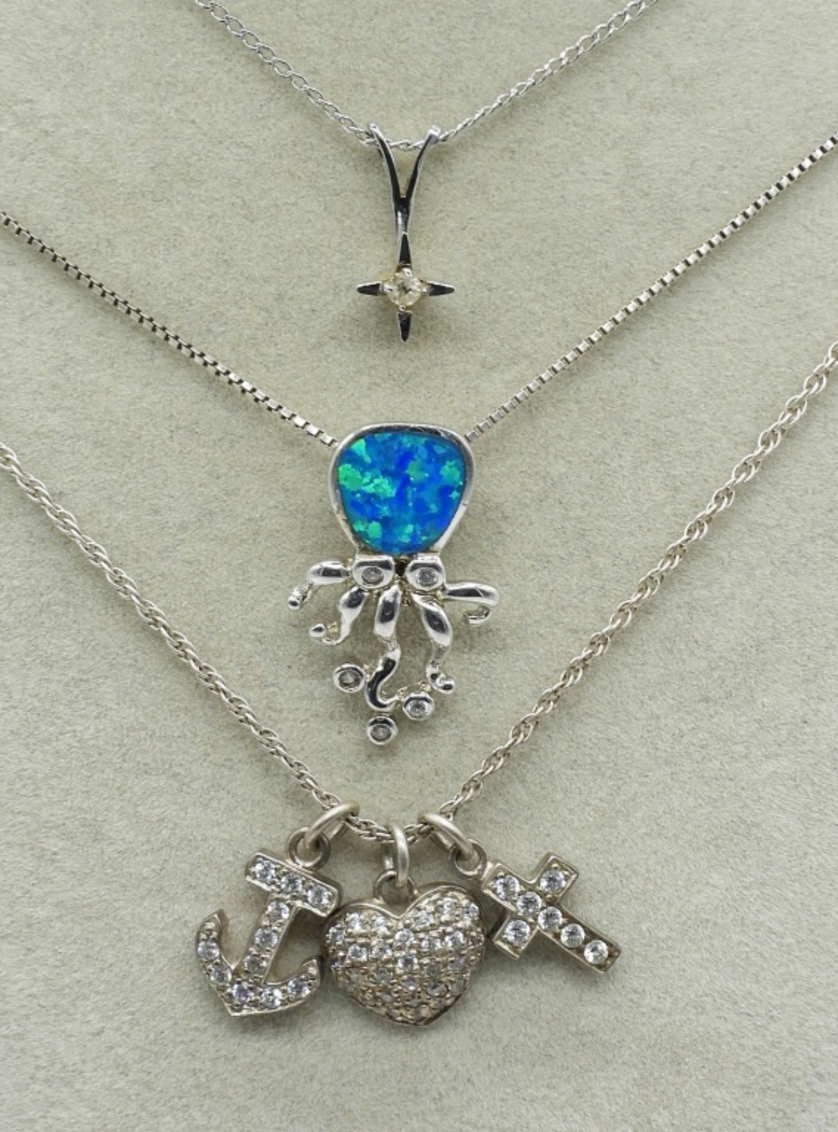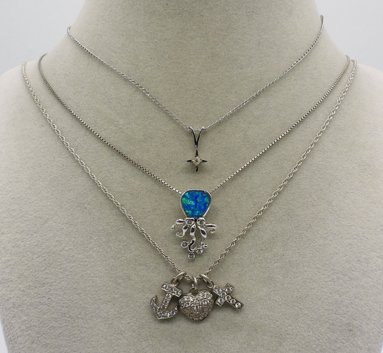 Three sterling fashion necklaces, opal and simulated diamond gemstones. Sterling chains are 16, 18 & 20 inches long. (7.3 dwt)