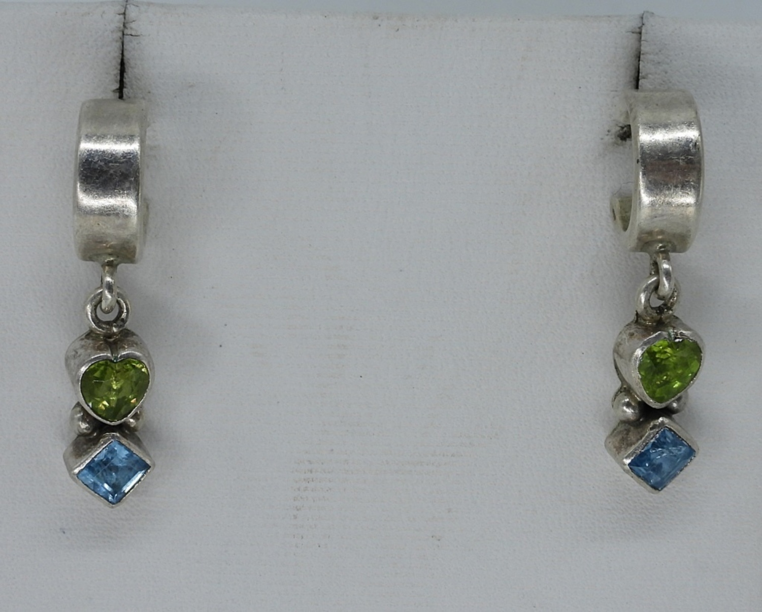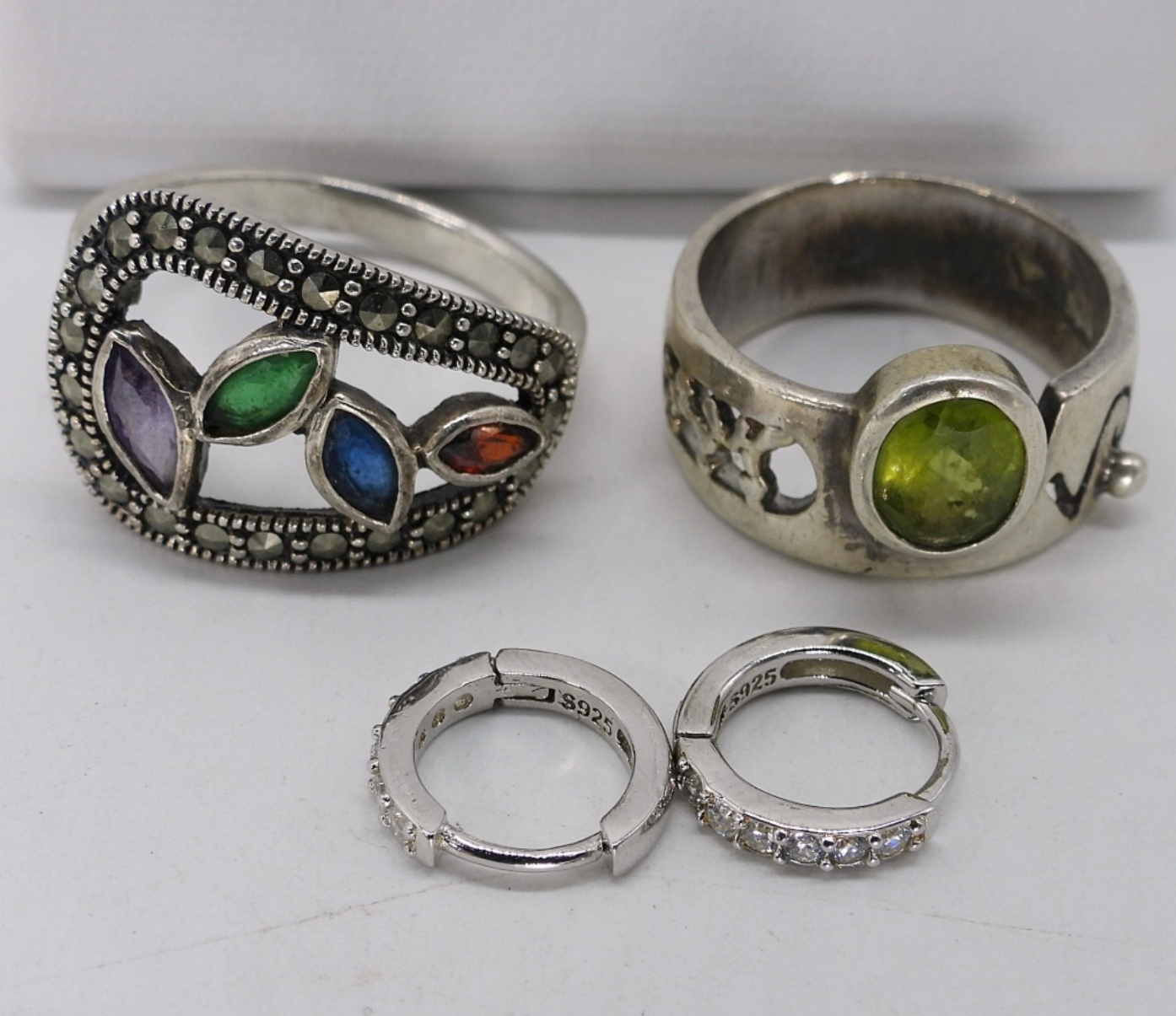 Two sterling rings with peridot and other gemstones, sizes 7 & 10. Two pair of sterling pierced earrings. (11 dwt)