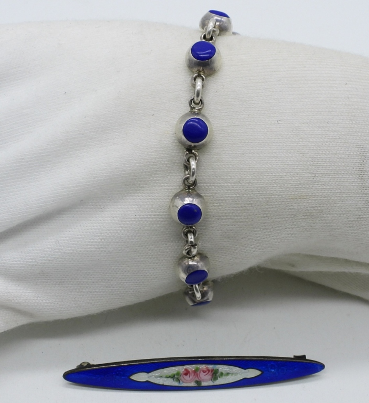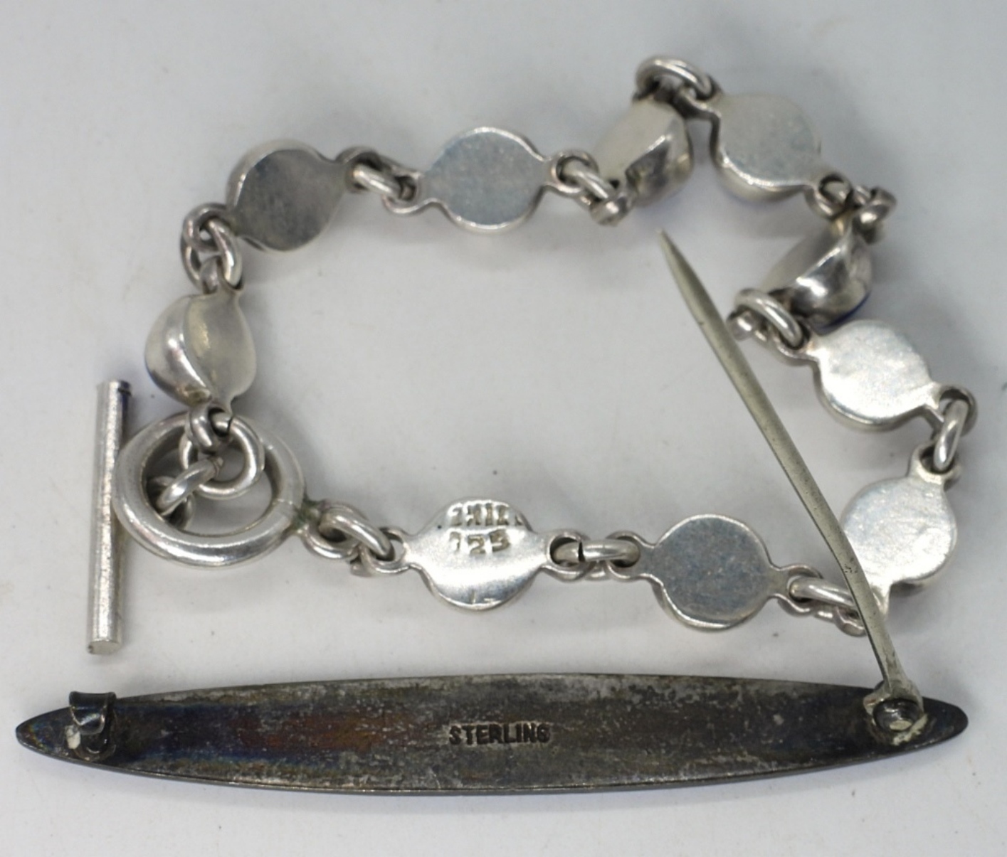 Vintage enamel sterling brooch, 2.5″ wide. Sterling lapis lazuli bracelet, toggle clasp, 7″. (13 dwt)