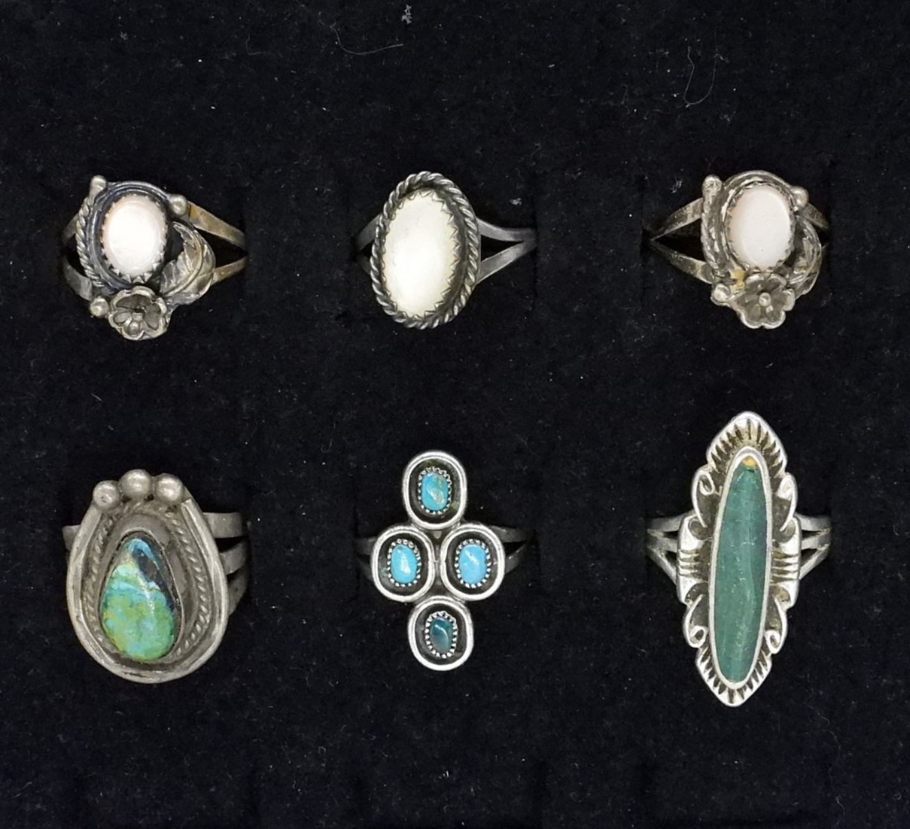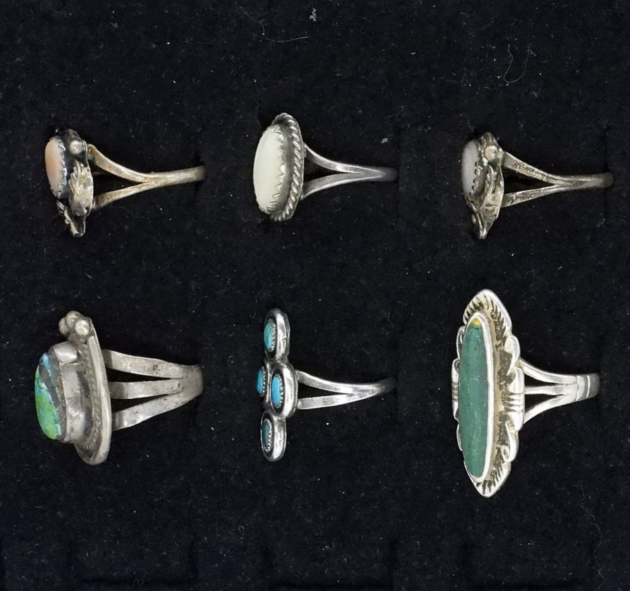 Six sterling rings, with turquoise and mother of pearl gemstones. Sizes 5.5 – 7.5 (12 dwt)