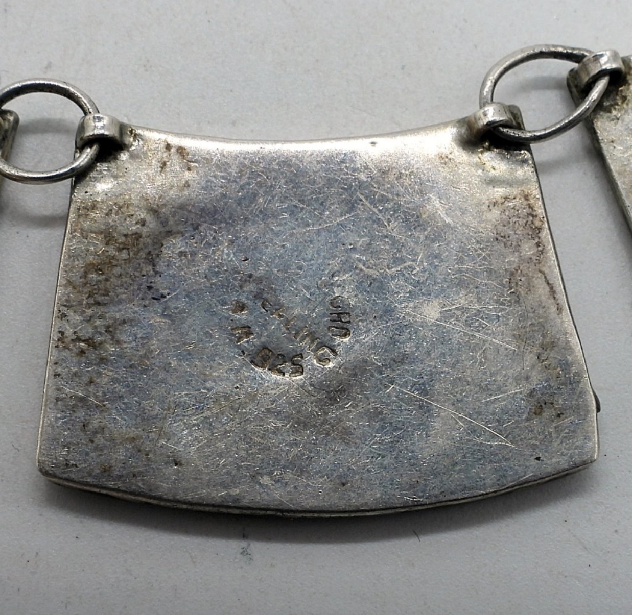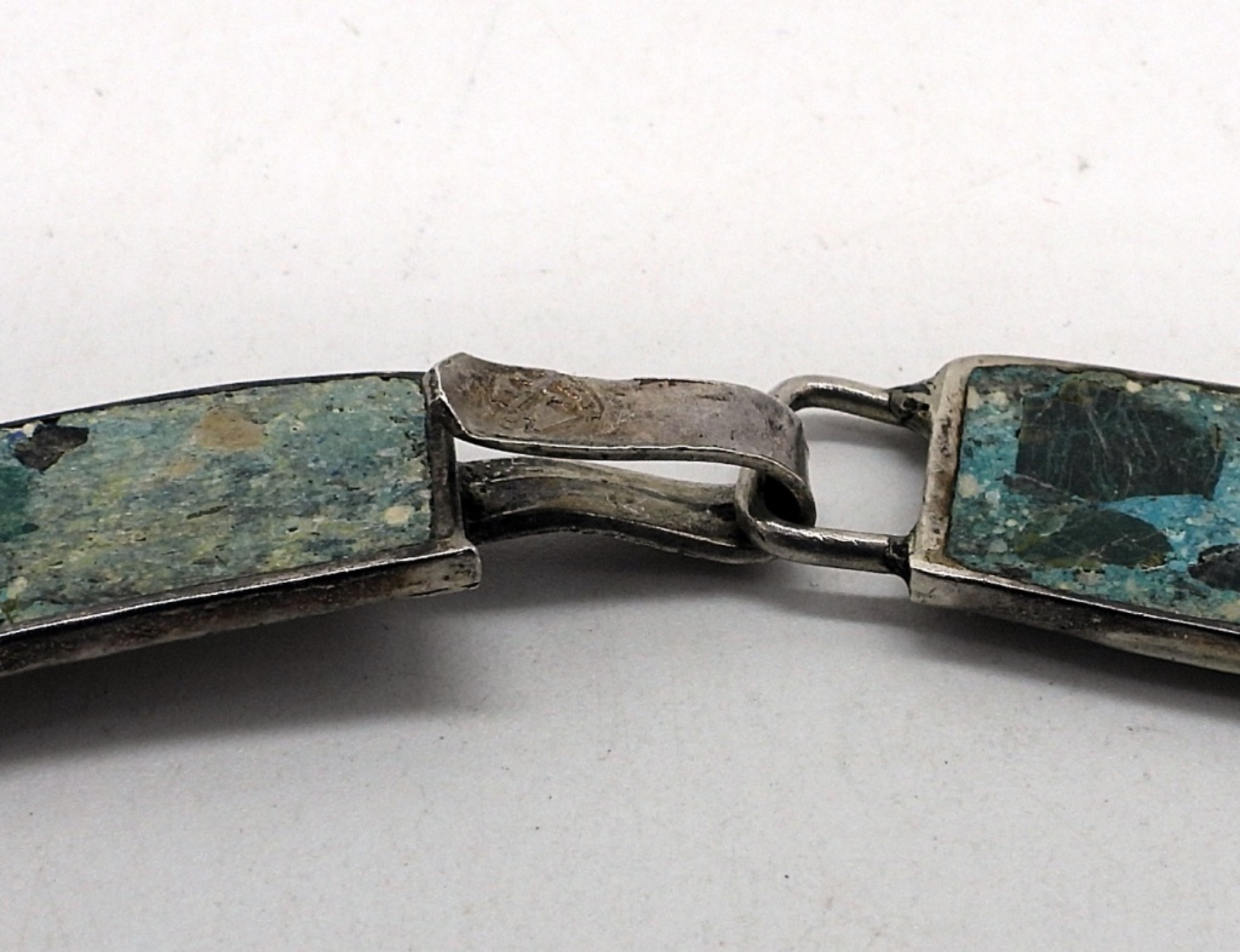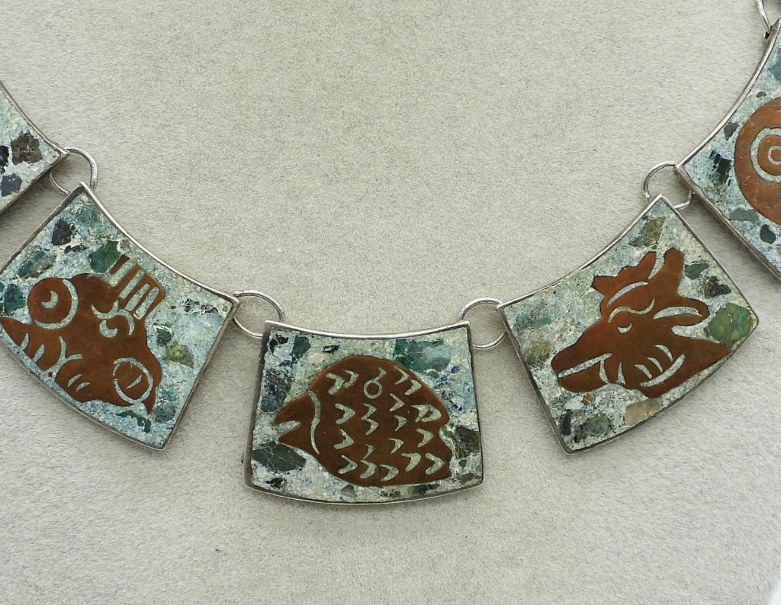 Mexico sterling and copper accent mosaic crushed turquoise necklace. 17″ long. (30 dwt)