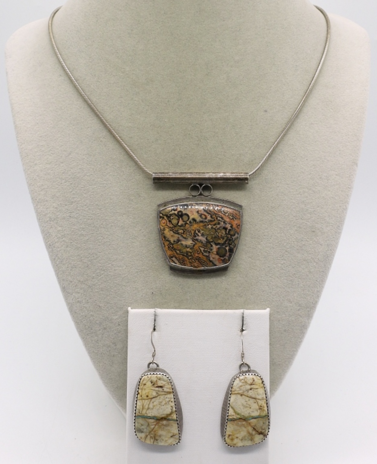 Native American sterling Ribbon Turquoise pierced earrings, 2″ long. Marked D. Morris Sterling. Leopard Skin Jasper slider pendant, 1.5″ on a sterling 20″ chain. (22 dwt)