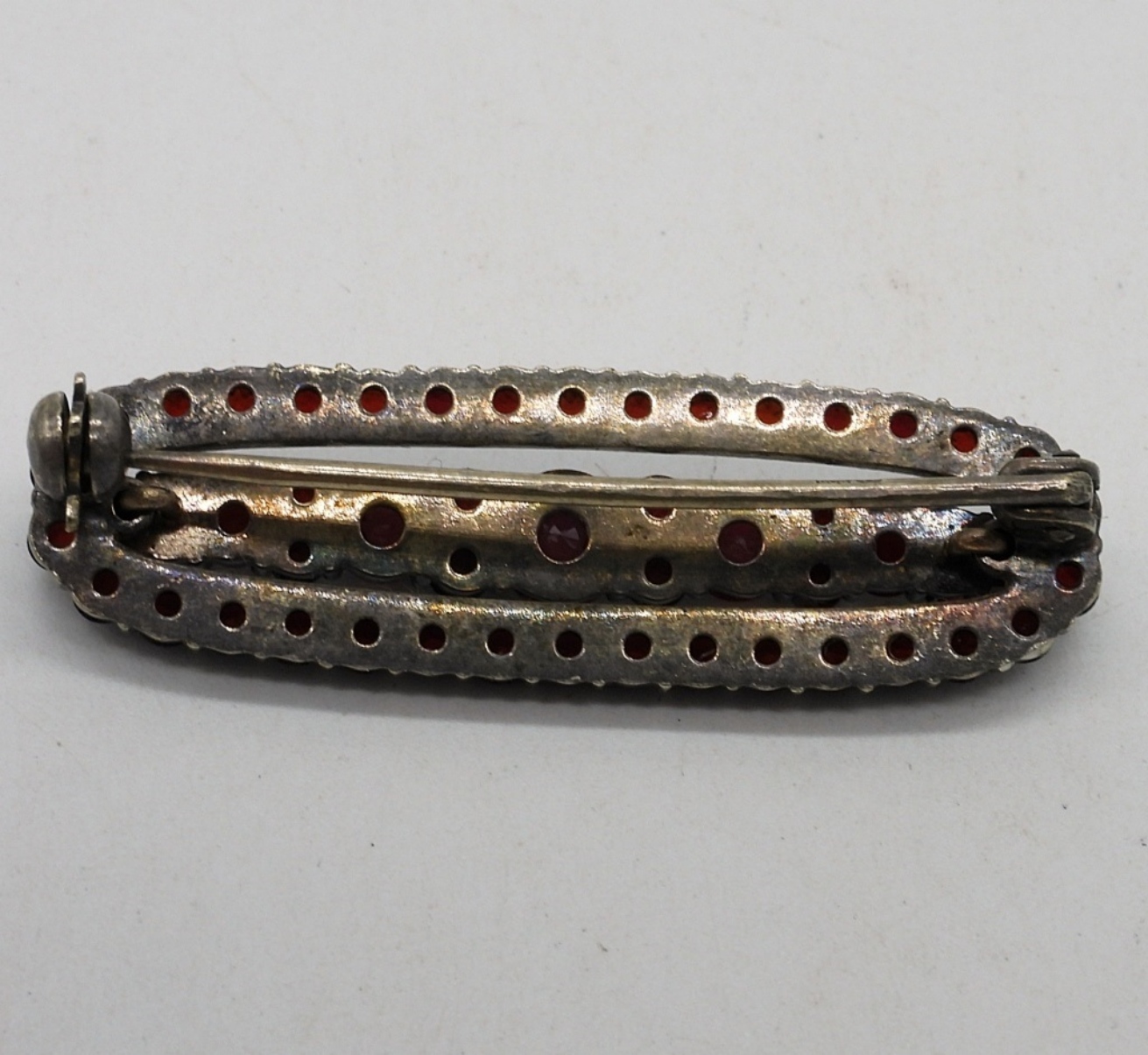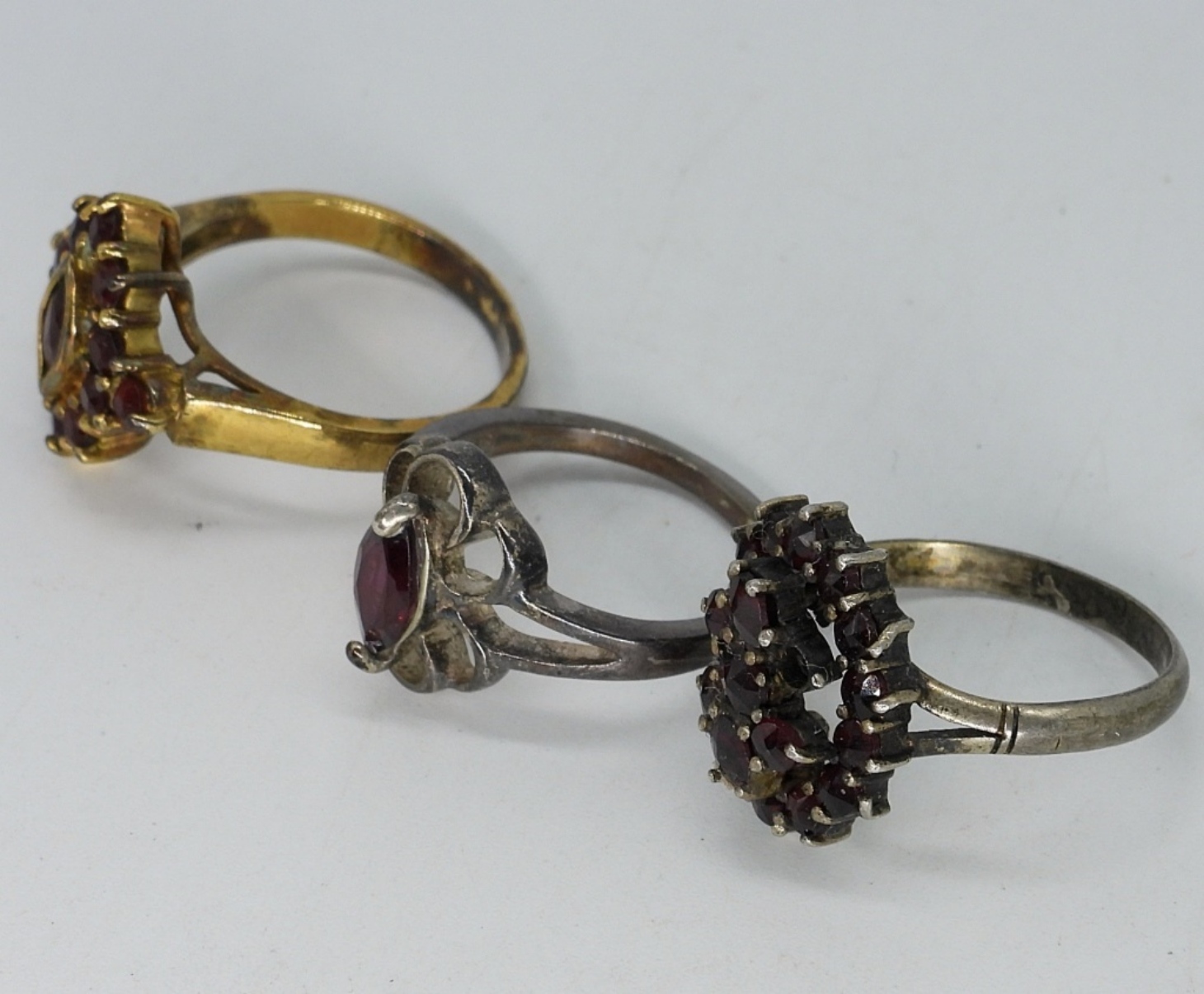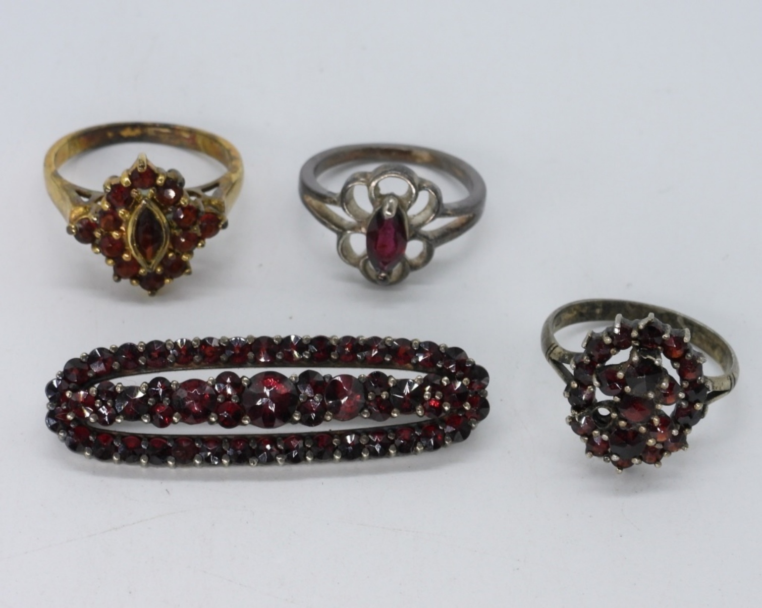 Vintage sterling garnet rings and brooch. Three sterling rings with garnet gemstones, sizes 5, 6, 7. Sterling garnet brooch, 1.5″ wide. (9.9 dwt)