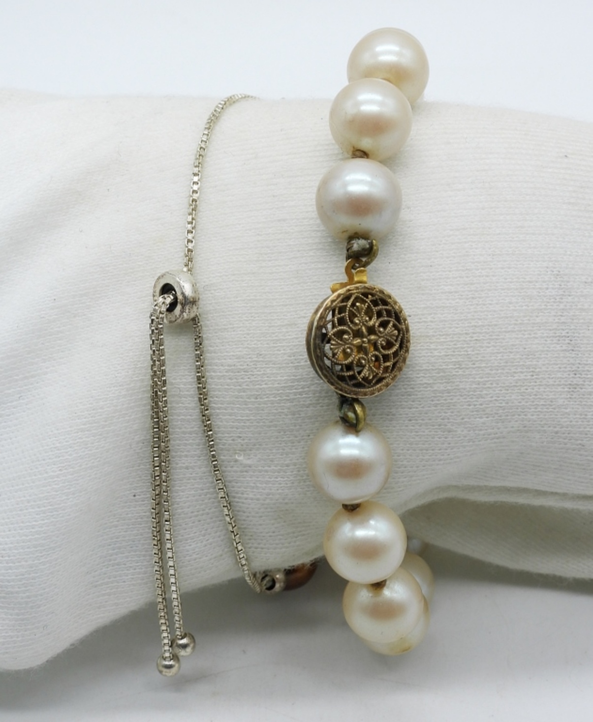 Two sterling bracelets with brown and white pearls. White pearls are 7.5″ long. Brown pearls are 11″ long (adjustable). (3 dwt)