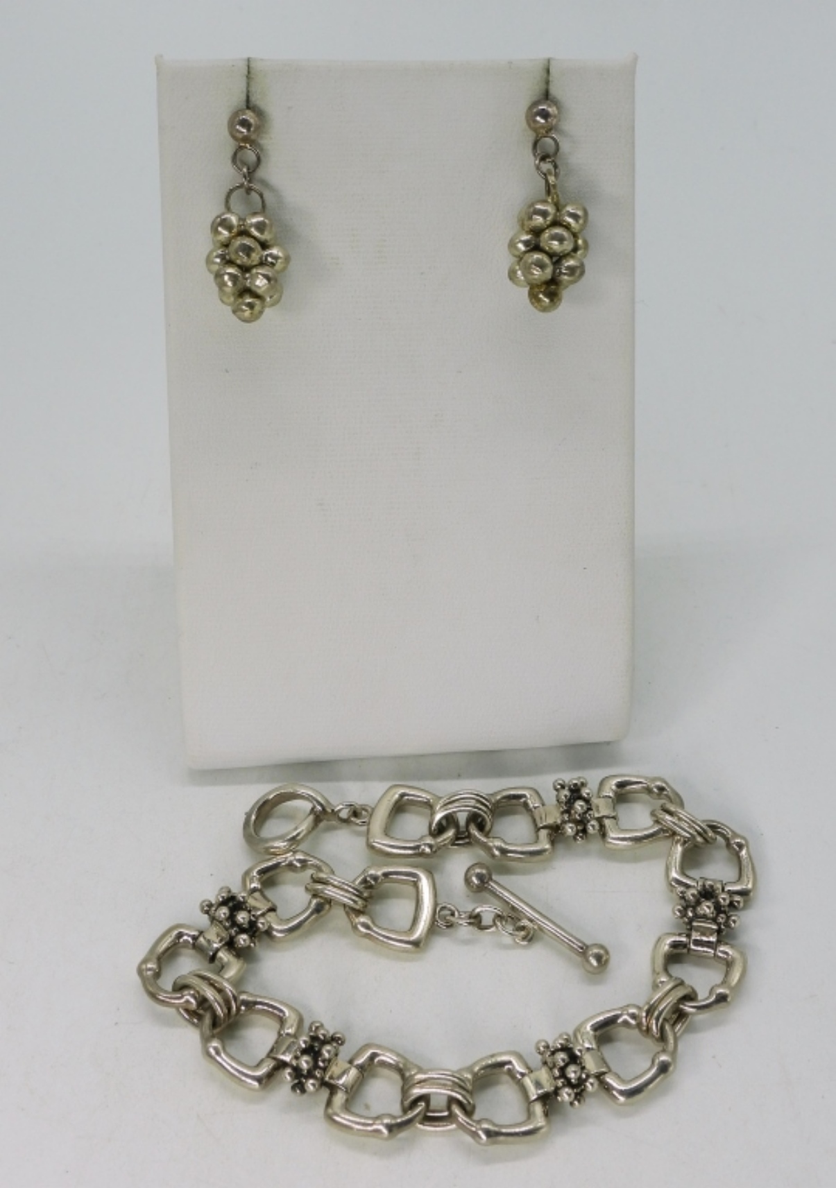 Matching sterling bracelet, 8″. Pierced earrings, 1″ long. (22 dwt)