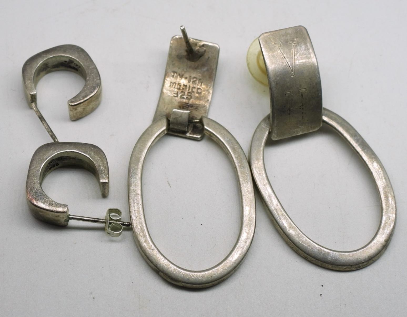 One pair of pierced Taxco (TV-124 Mexico 925) 2″ long. Two rings, sizes 6 & 7.5 (17.3 dwt)