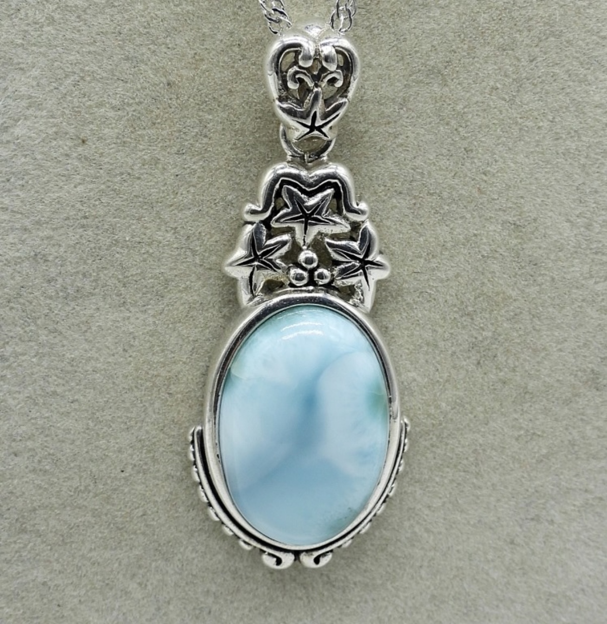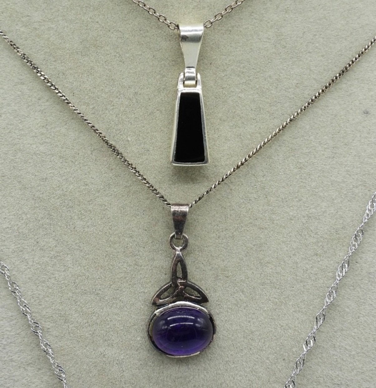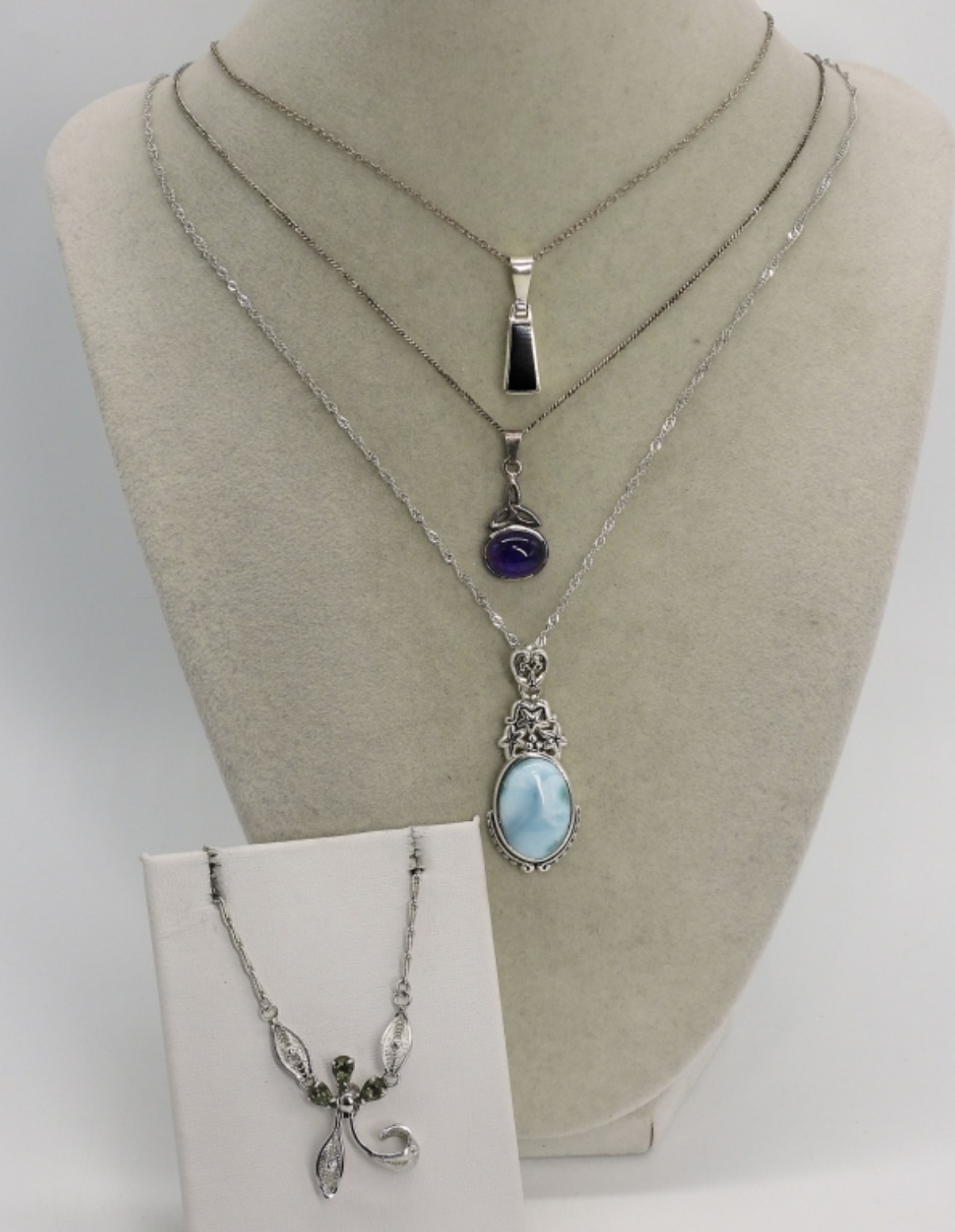 Four sterling necklaces with Larimar, Black Onyx, Amethyst & Rhinestones. Sterling chains are 18″ & 20″. (11.7 dwt)