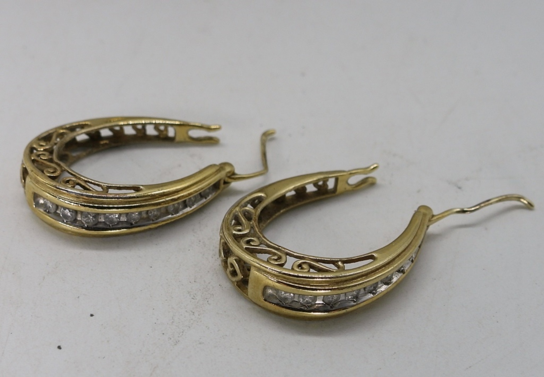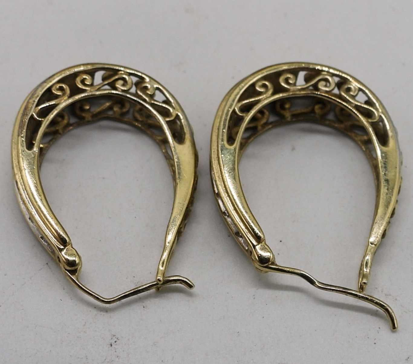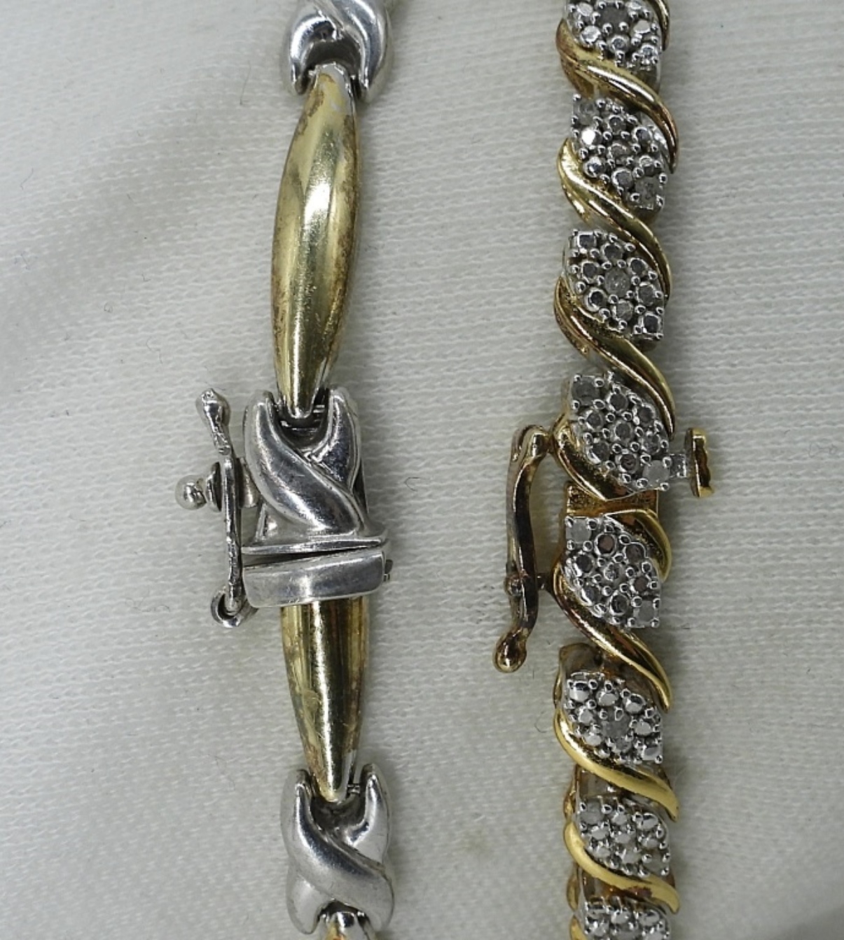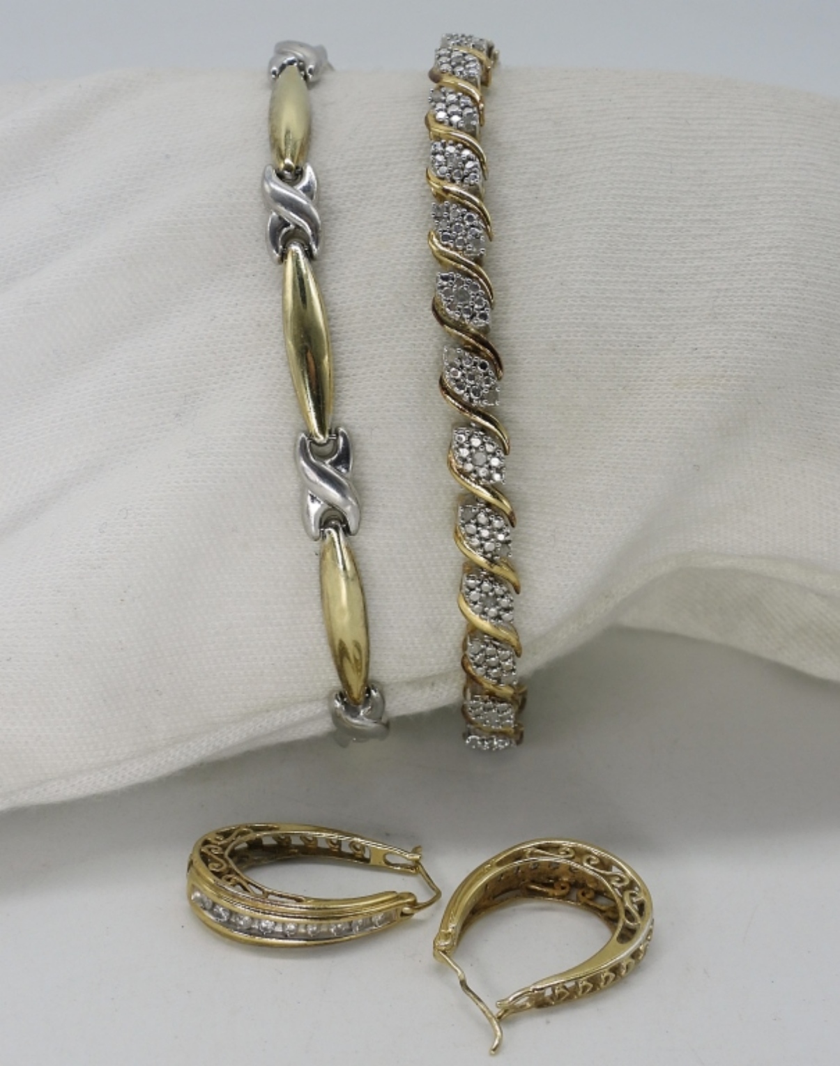 Two gold tone sterling bracelets, 7-7.5″ long. Pierced gold tone 925 earrings, 1″ long. (12.4 dwt)