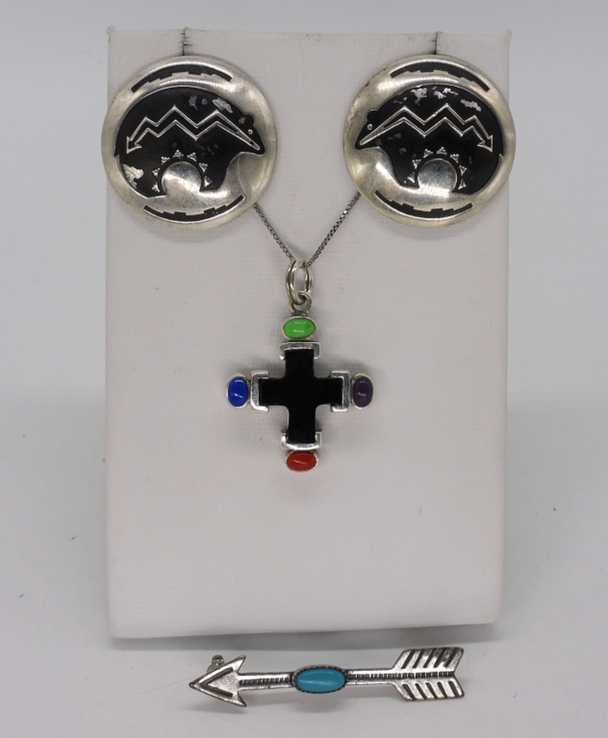 Southwest style sterling necklace, 18″. Arrow pin with turquoise gemstone, 1.5″. Pierced sterling earrings, 1″. (9.8 dwt)