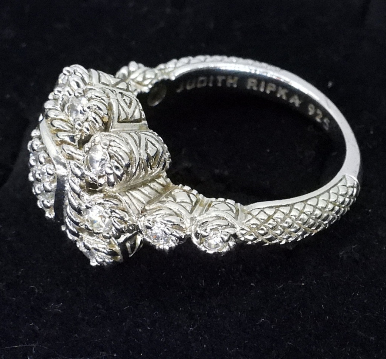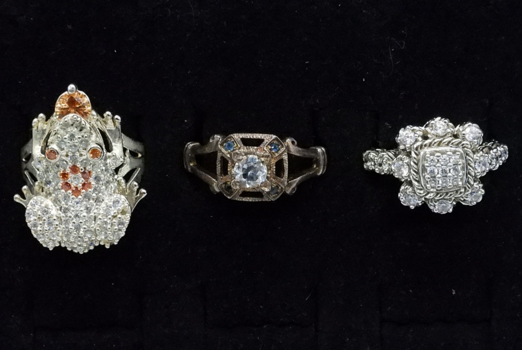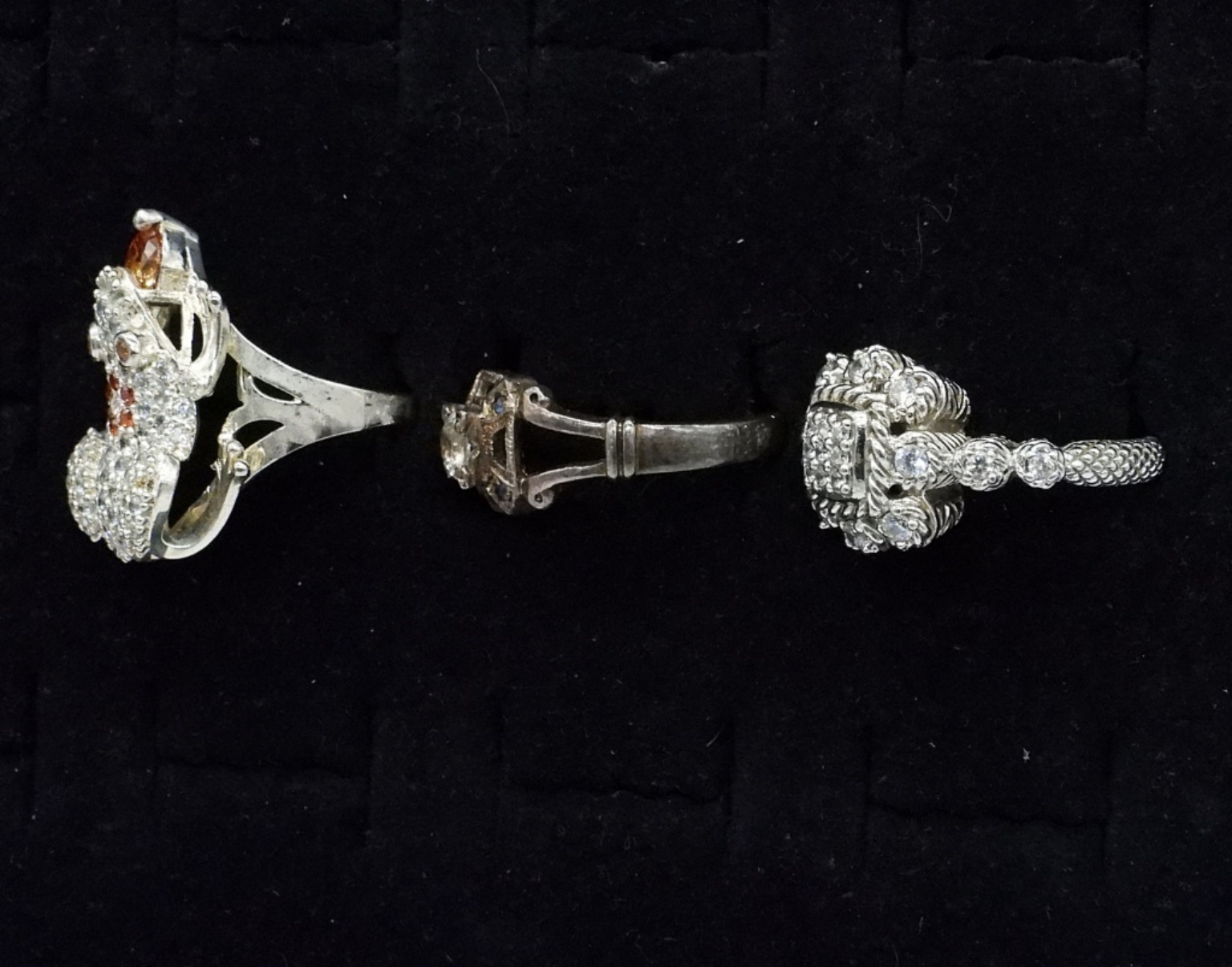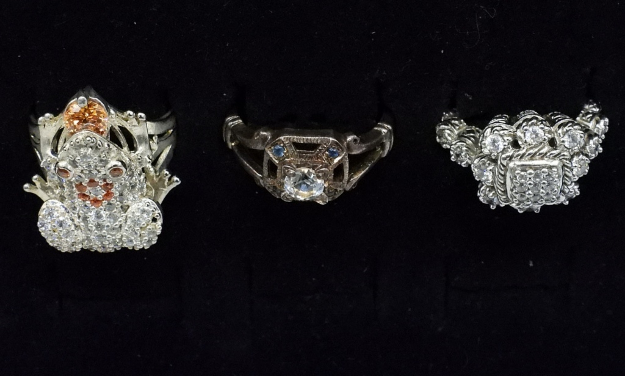 Three sterling rings. Judith Ripka ring, size 8. Other two rings are size 9 & 10. (12 dwt)
