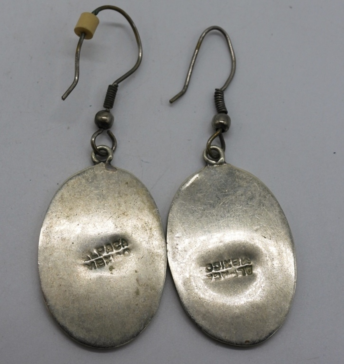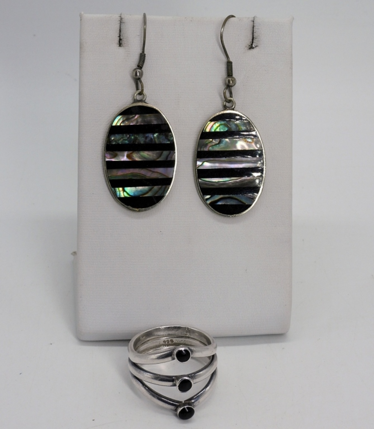 Sterling Alpaca Mexico abalone pierced earrings, 2″ long. Black Onyx ring, size 10. (9.9 dwt)