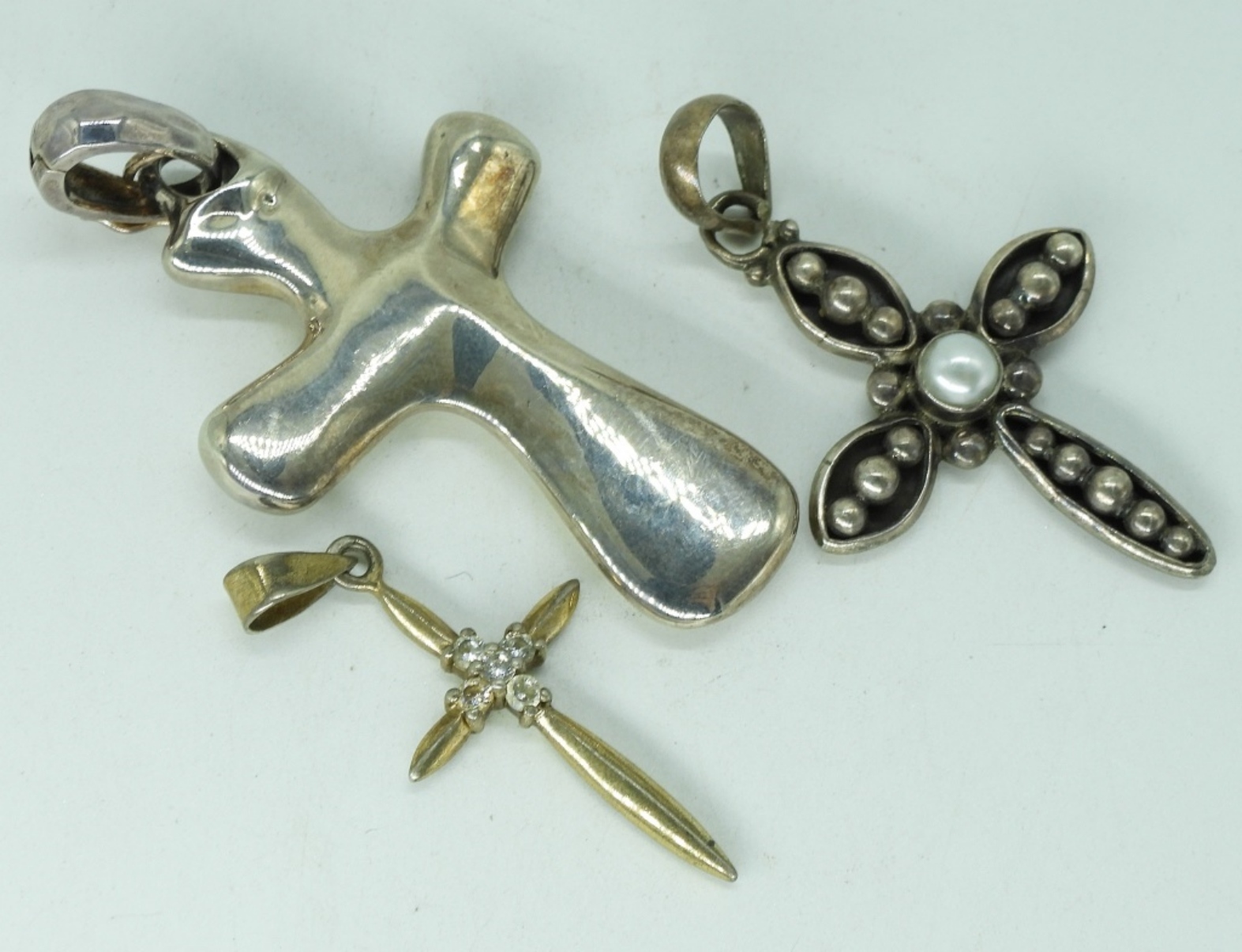 Four sterling cross pendants with a few gemstones. 1.5″ – 2.5″. Sterling chain is 20″ long. (19 dwt)