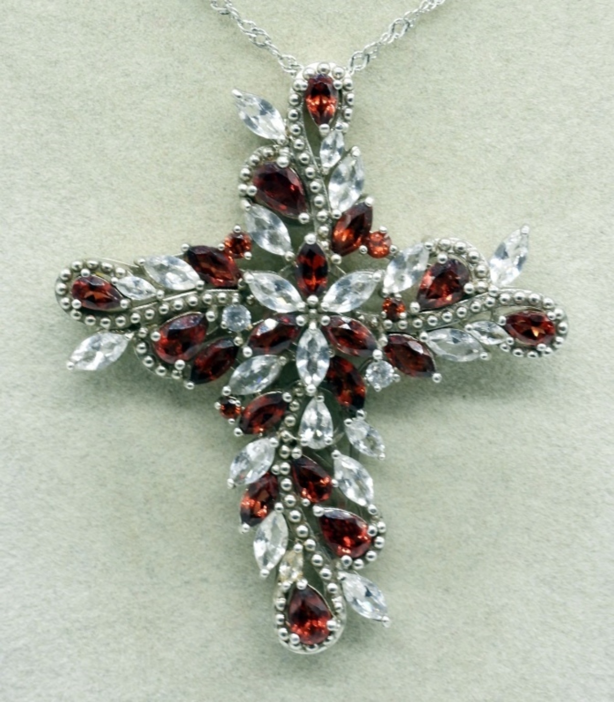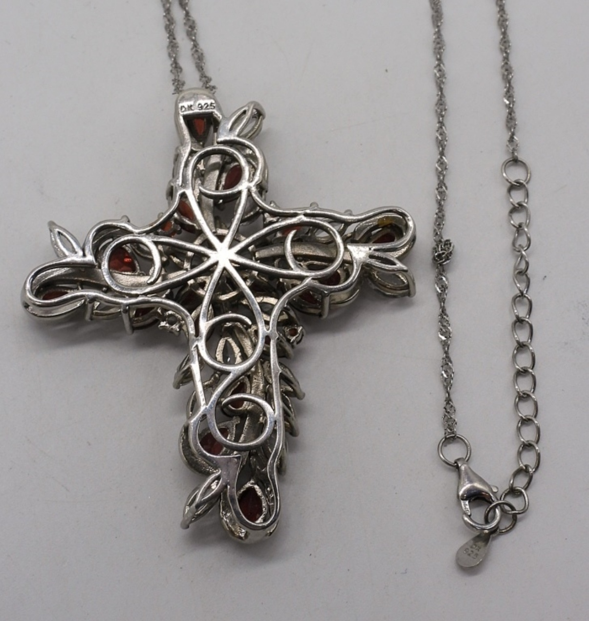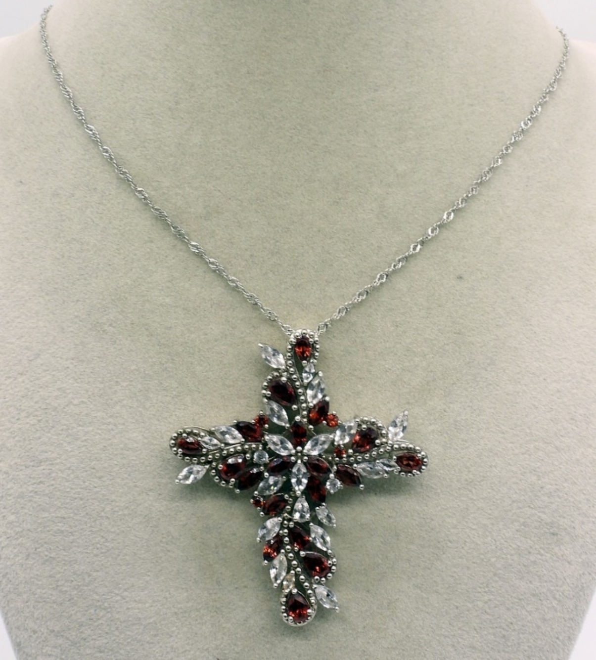 Large sterling cross pendant with garnets and simulated diamonds, 2″ x 2″. On a 20″ sterling chain. (10.2 dwt)
