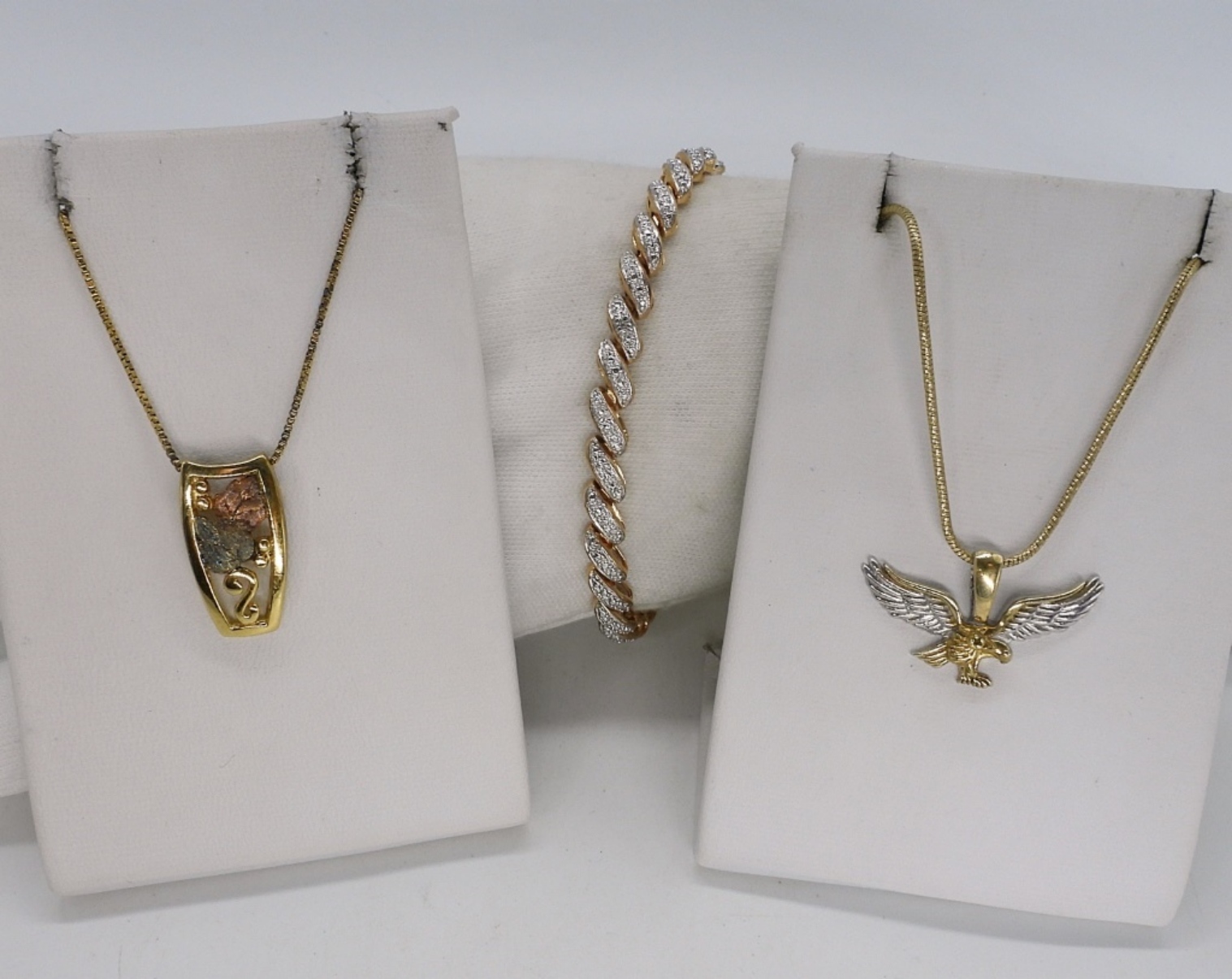 Two sterling gold tone necklaces, 18-20″ long chains. Sterling gold tone bracelet, 7″ long. (14.9 dwt)