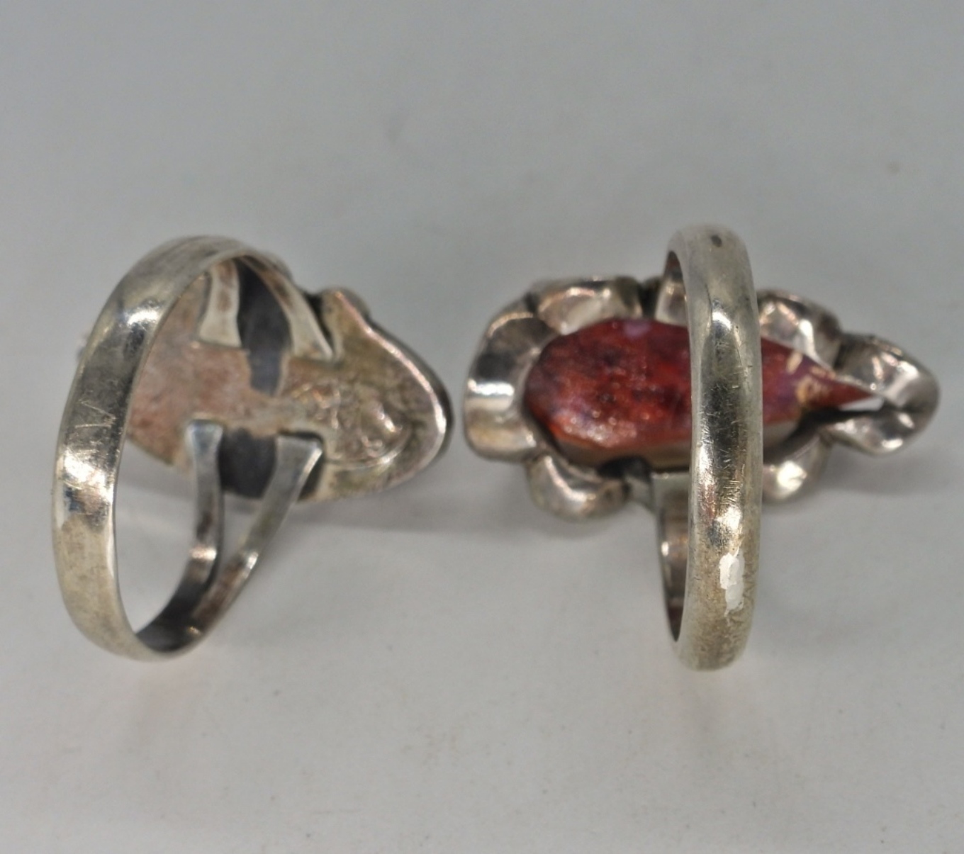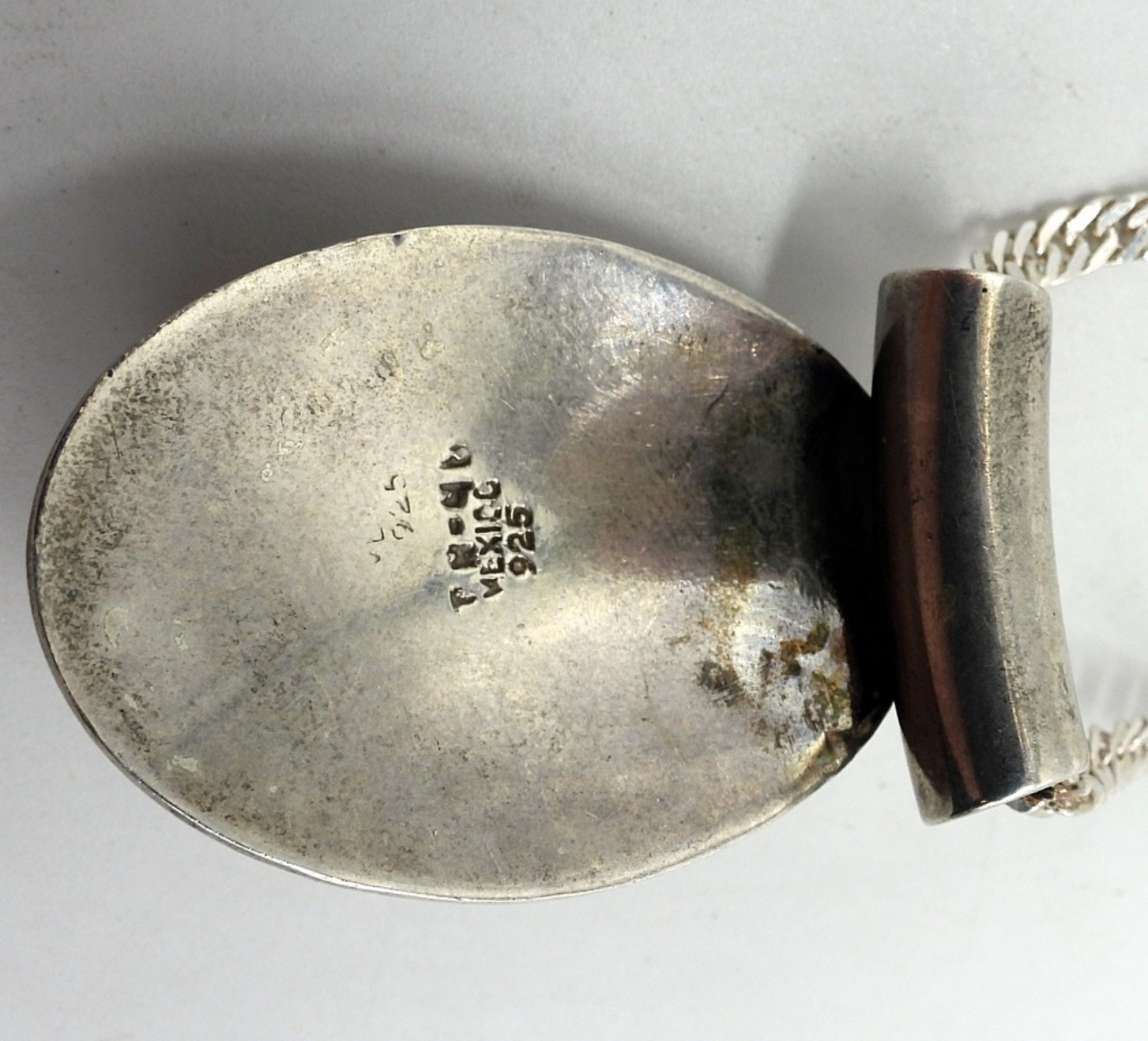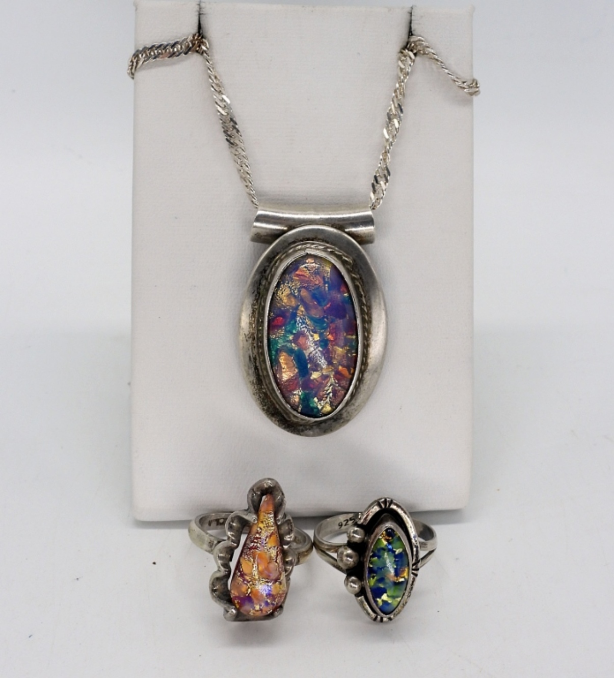 Taxco 925 mosaic glass slider pendant, 1 3/4″ long on a 18″ sterling chain. Two similar rings (not Taxco), sizes 7 & 9. (16.3 dwt)