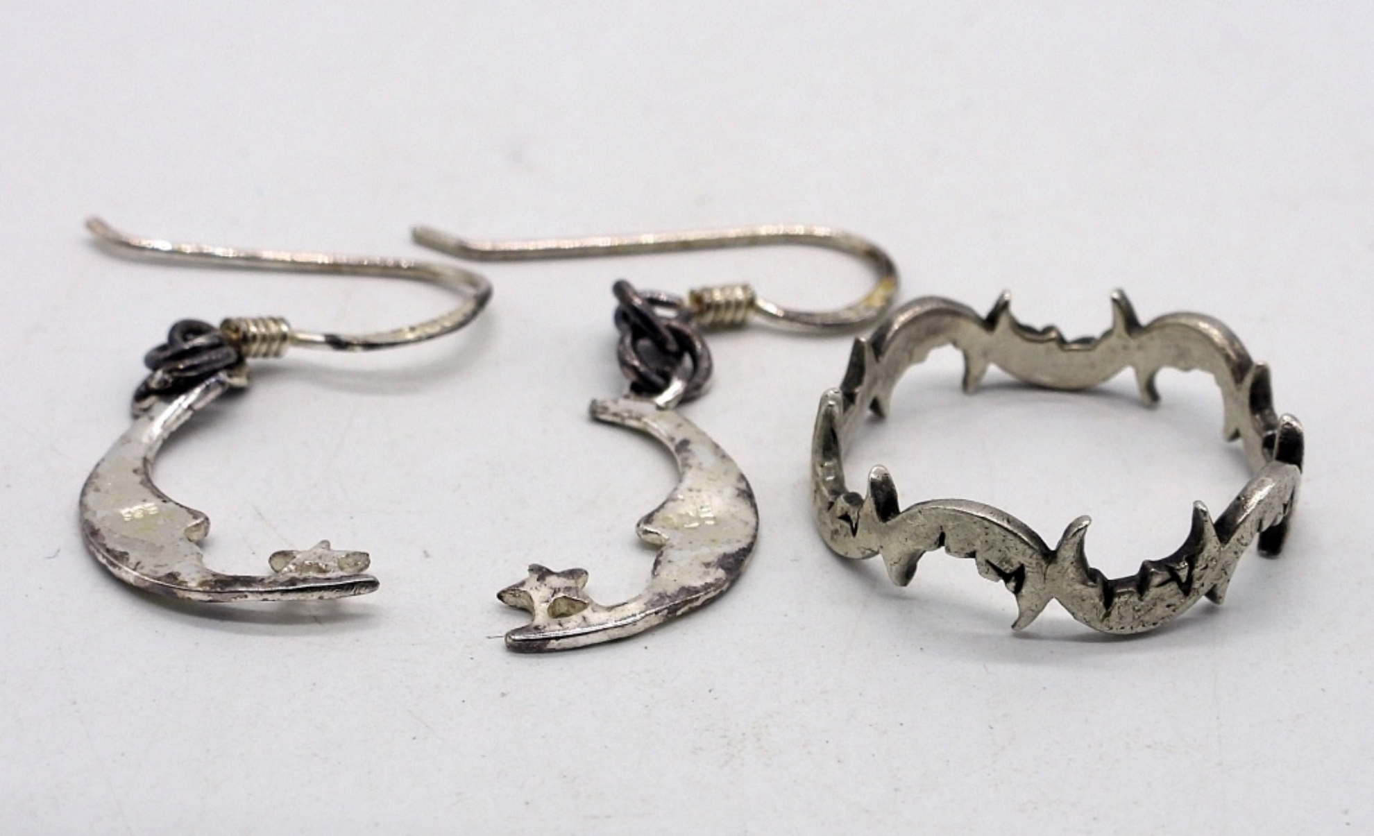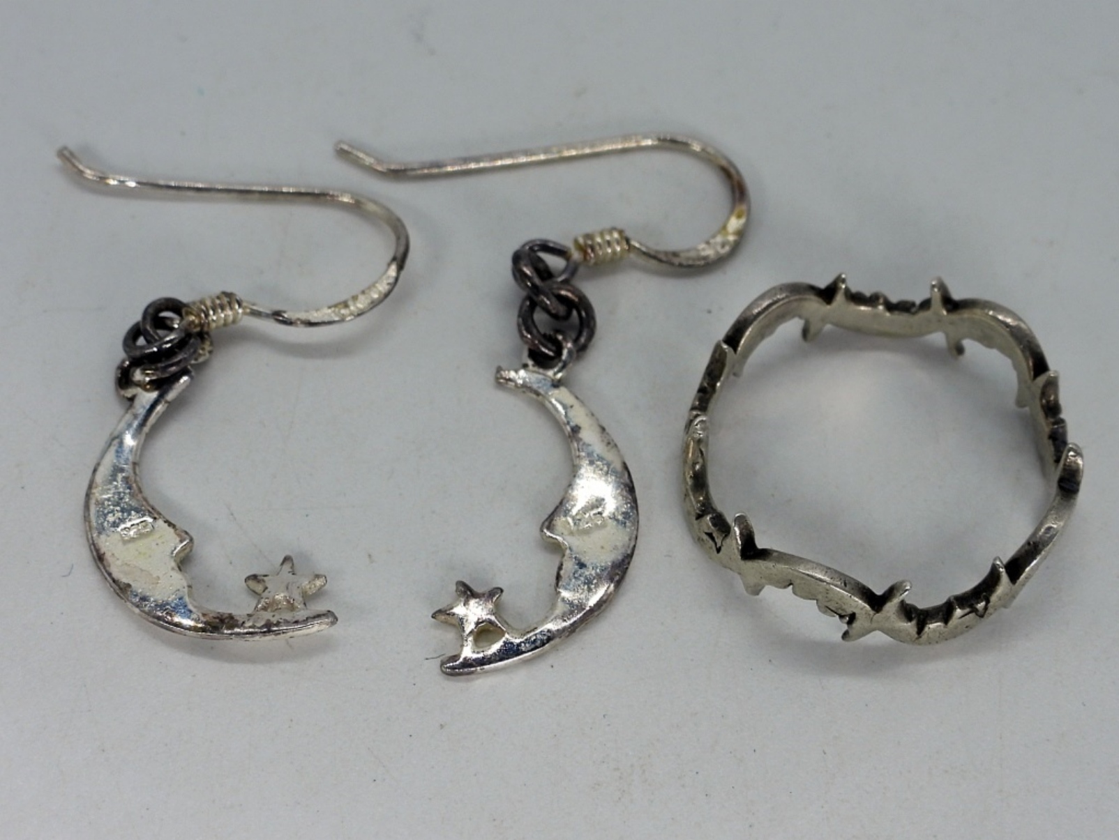 Sterling Moon and Stars ring size 6. Pierced matching earrings, 1 3/4″ long. (2 dwt)