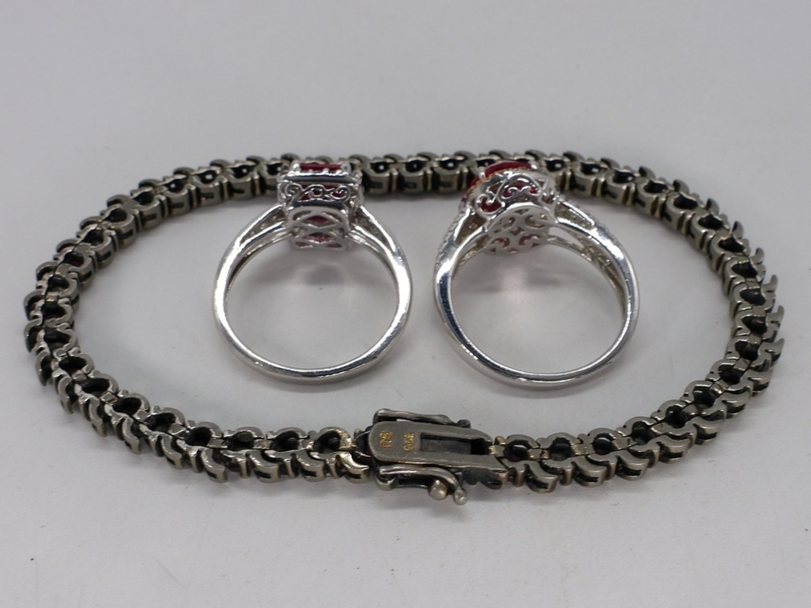 Simulated Ruby & Diamond sterling bracelet 7″ long. Two sterling simulated ruby rings, size 7. (13 dwt)