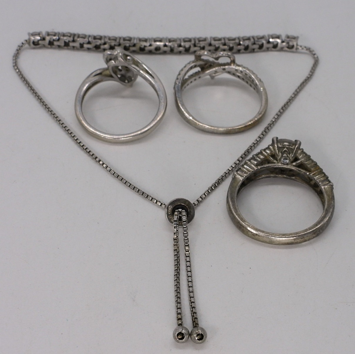 Three sterling fashion rings, sizes 6.5-7.5. Bracelet is adjustable. (9 dwt)