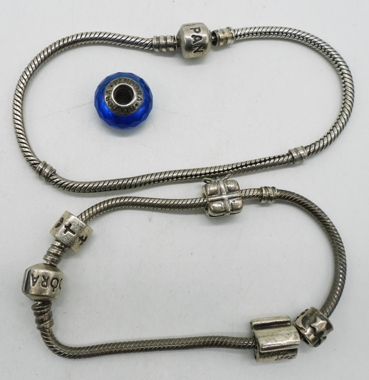 Two sterling pandora charm bracelets with 5 beads. (28 dwt)