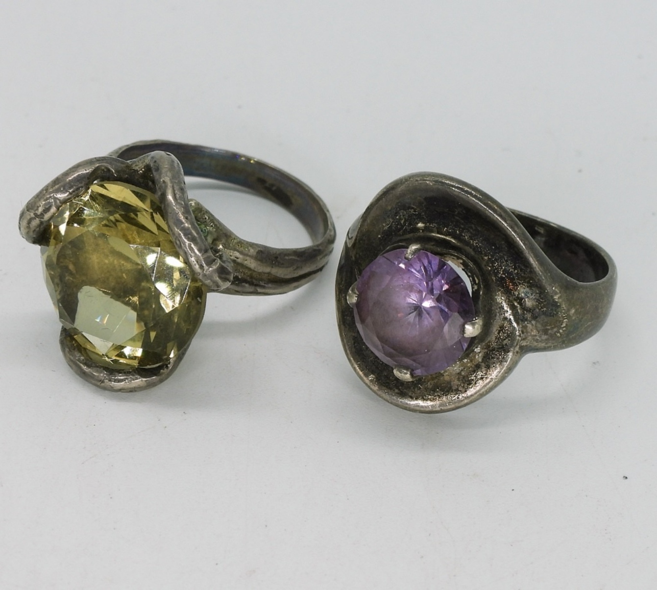 Two sterling necklaces, 18-20″ long. Two sterling rings, amethyst & citrine. Sizes 5.5 & 7 (14 dwt)