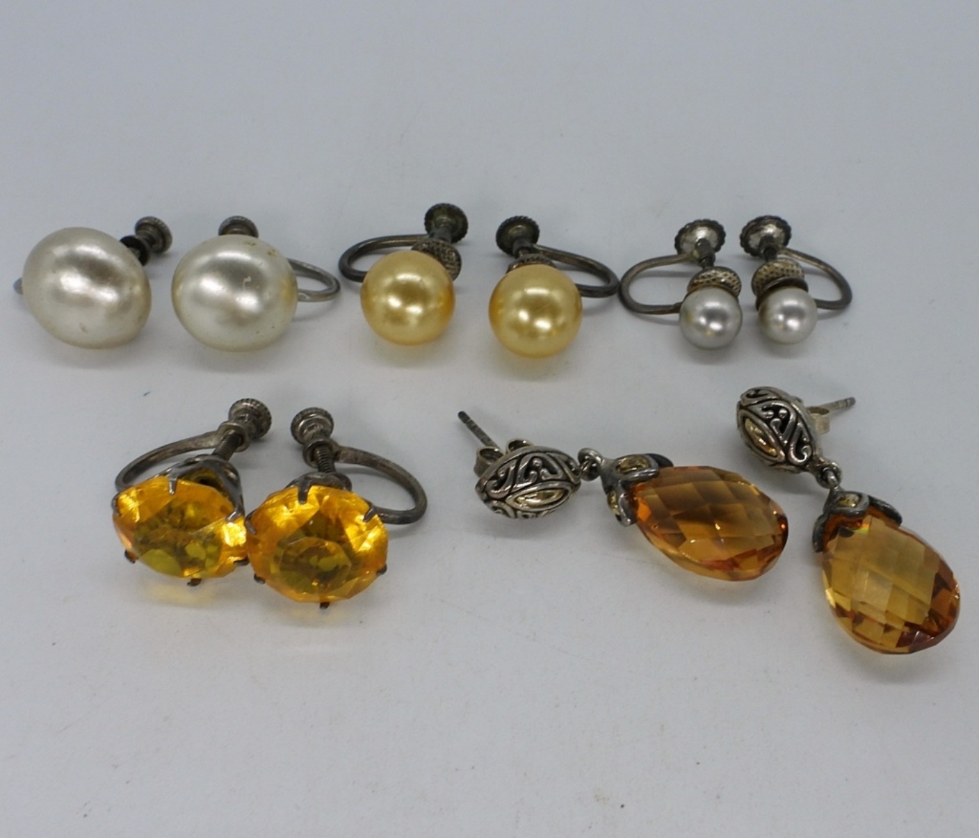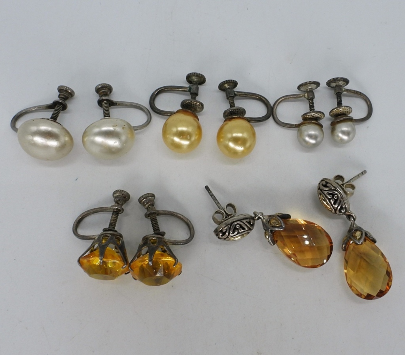 Five pair of vintage sterling earrings. Vintage pearls, rhinestones and citrine. Four pair are screw backs, one pair is pierced. (9.9 dwt)