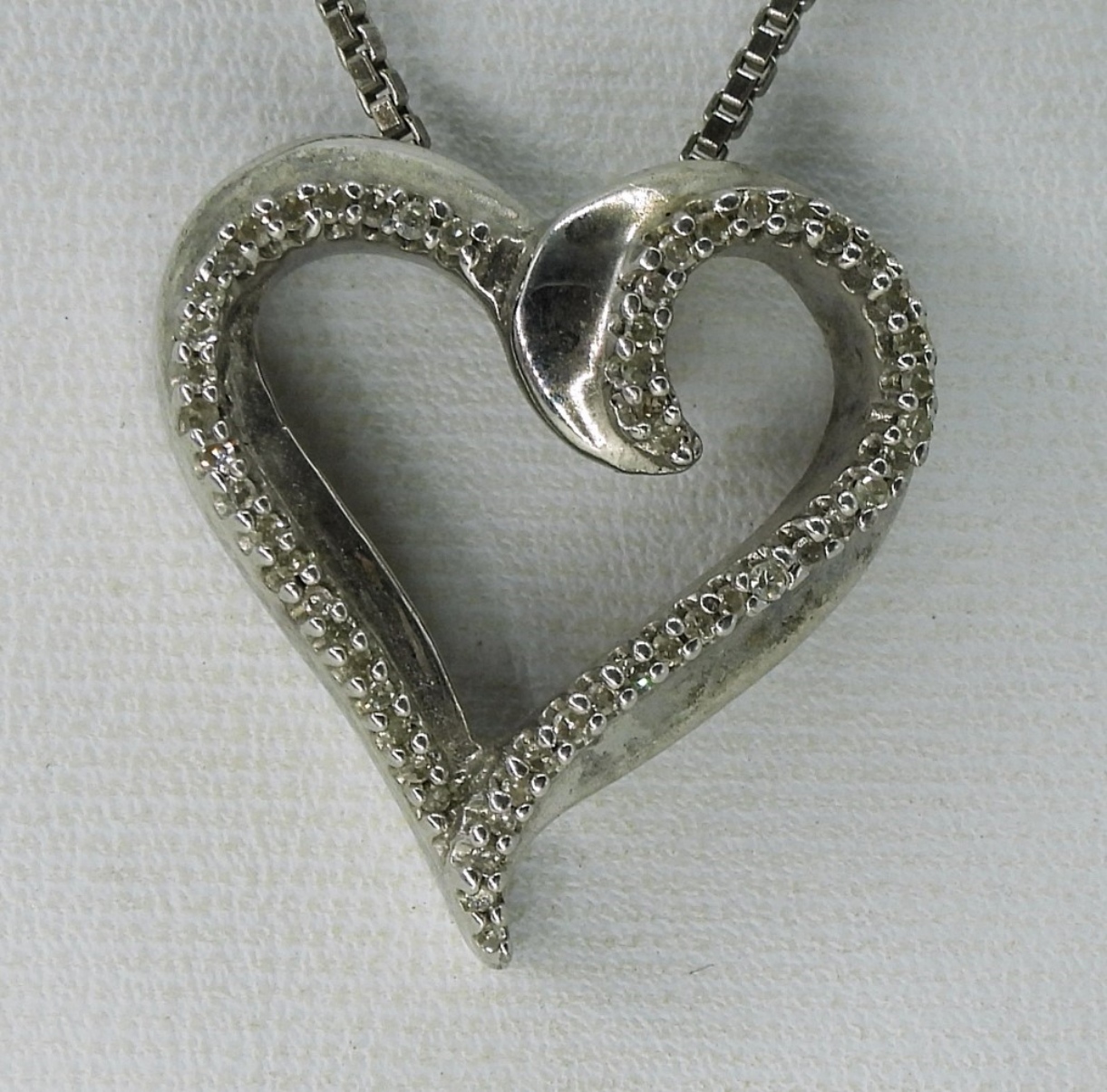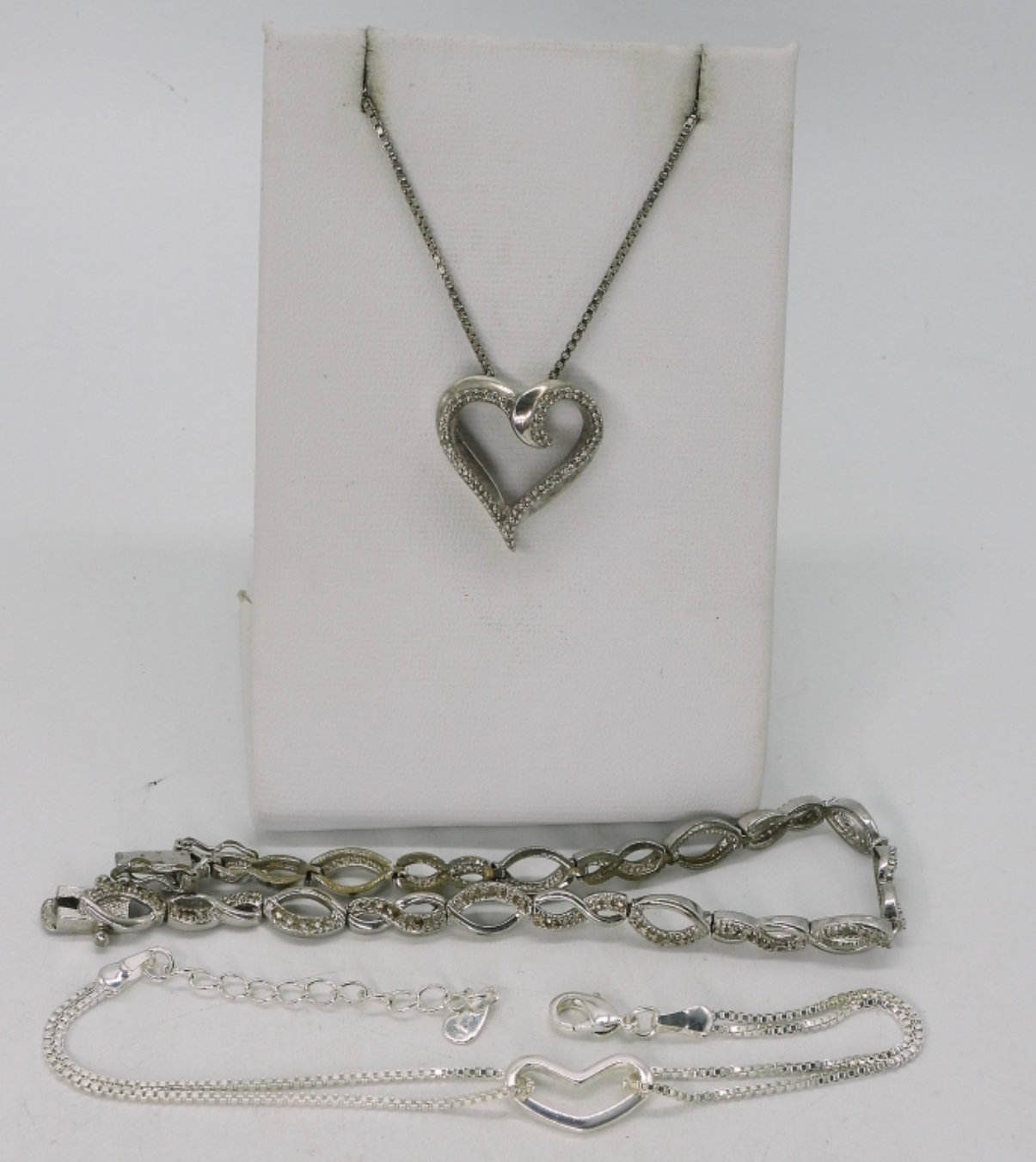 One sterling heart necklace with moissanite gemstones (tested), 18″ long. Two sterling bracelets, 7.5″. (11.4 dwt)