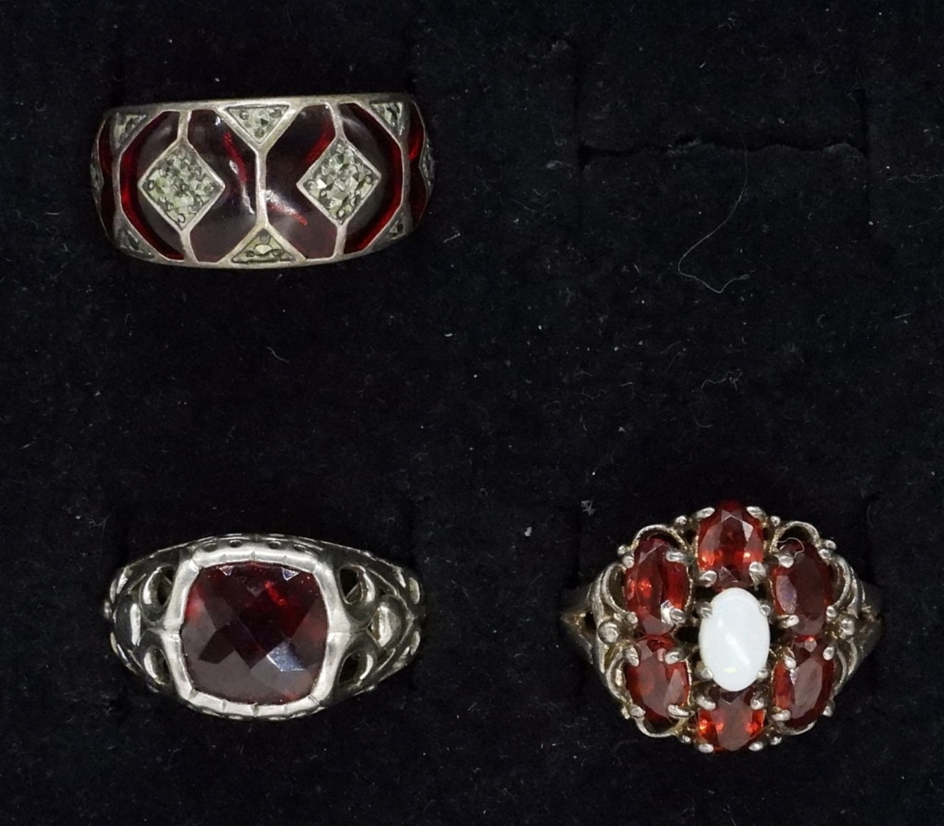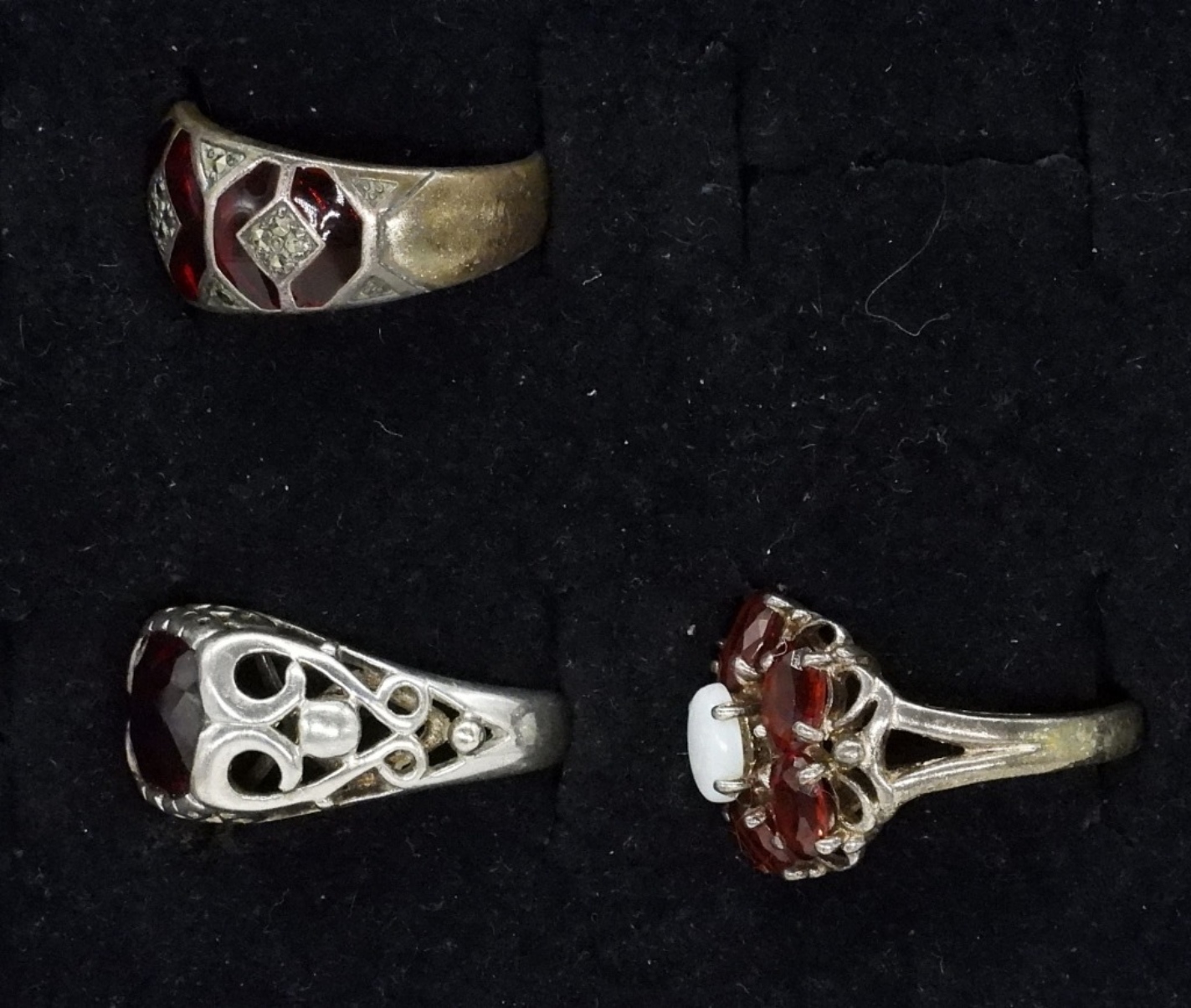 Three sterling rings with garnet and opal gemstones, sizes 5, 7, 7.5. (9 dwt)