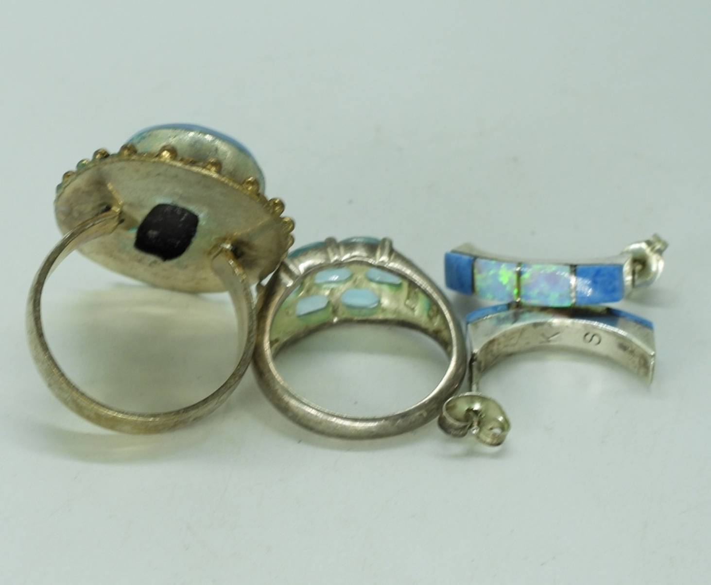Large opal ring, size 8. Opal measures 1″ x .5″. Two necklaces, 18-20″ long. Other ring is size 6. Pierced opal earrings. (19 dwt)