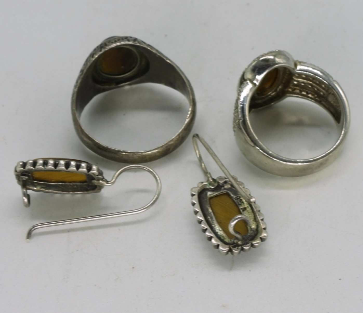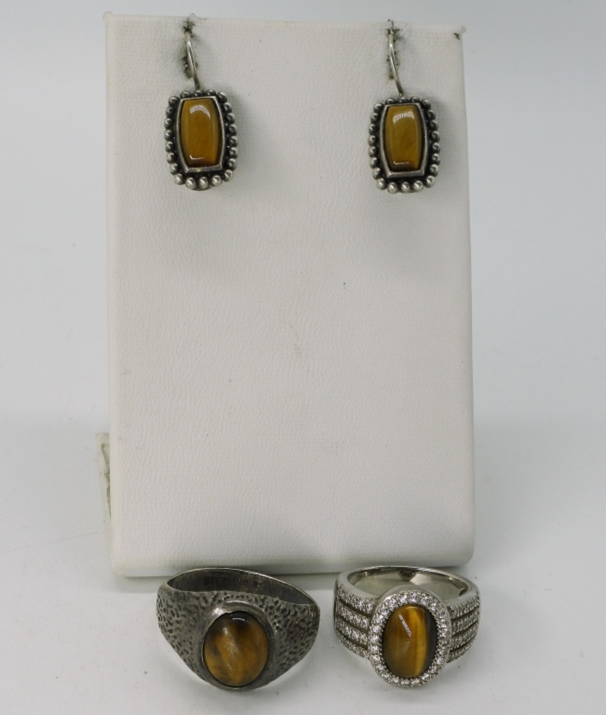 Two vintage sterling rings with tigers eye gemstones, sizes 8 & 12. Simulated diamonds on the ladies ring. One pair of sterling pierced, tigers eye earrings, 1″ long. (13 dwt)
