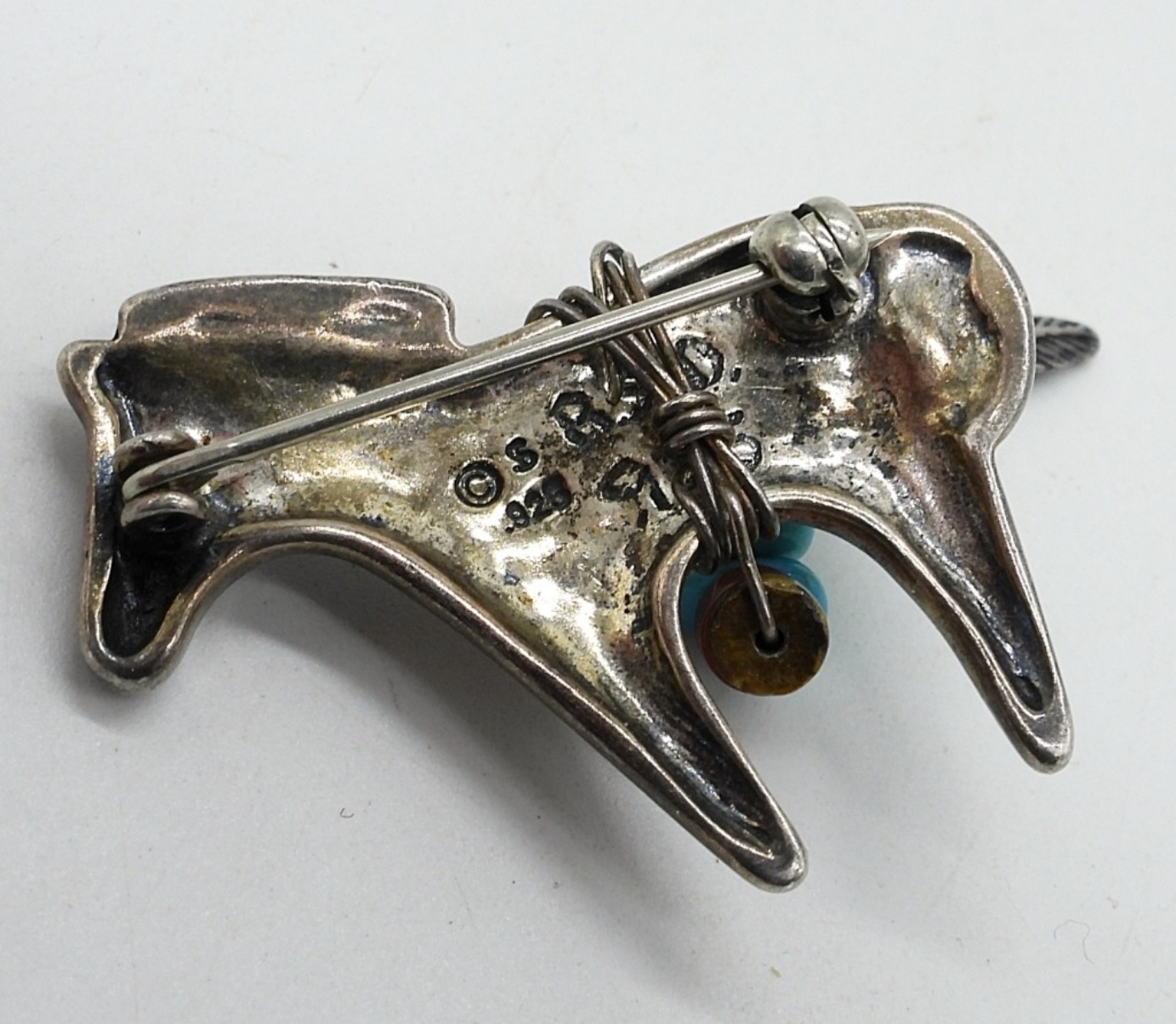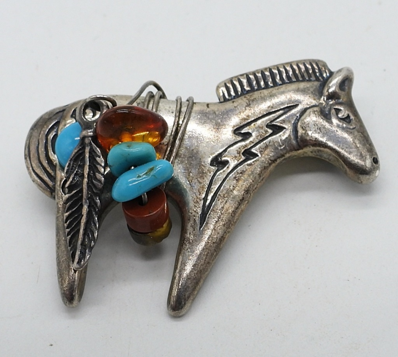 Navajo Sterling, Turquoise & Amber beaded Horse Pin. See photos for markings. 1.5″ (5.4 dwt)