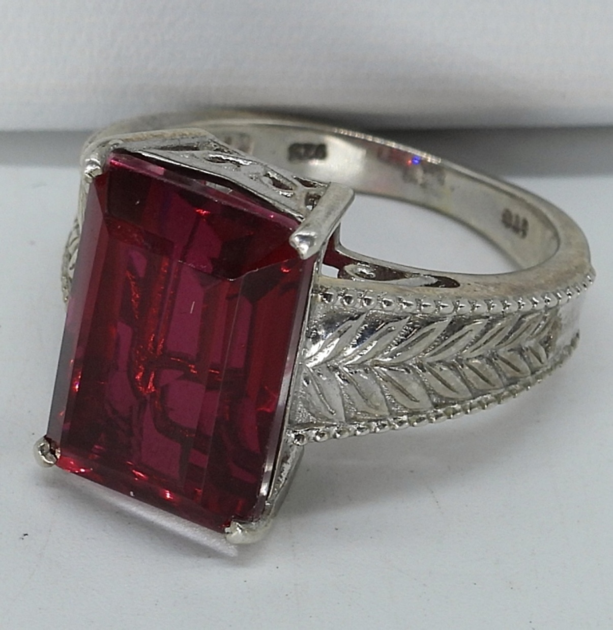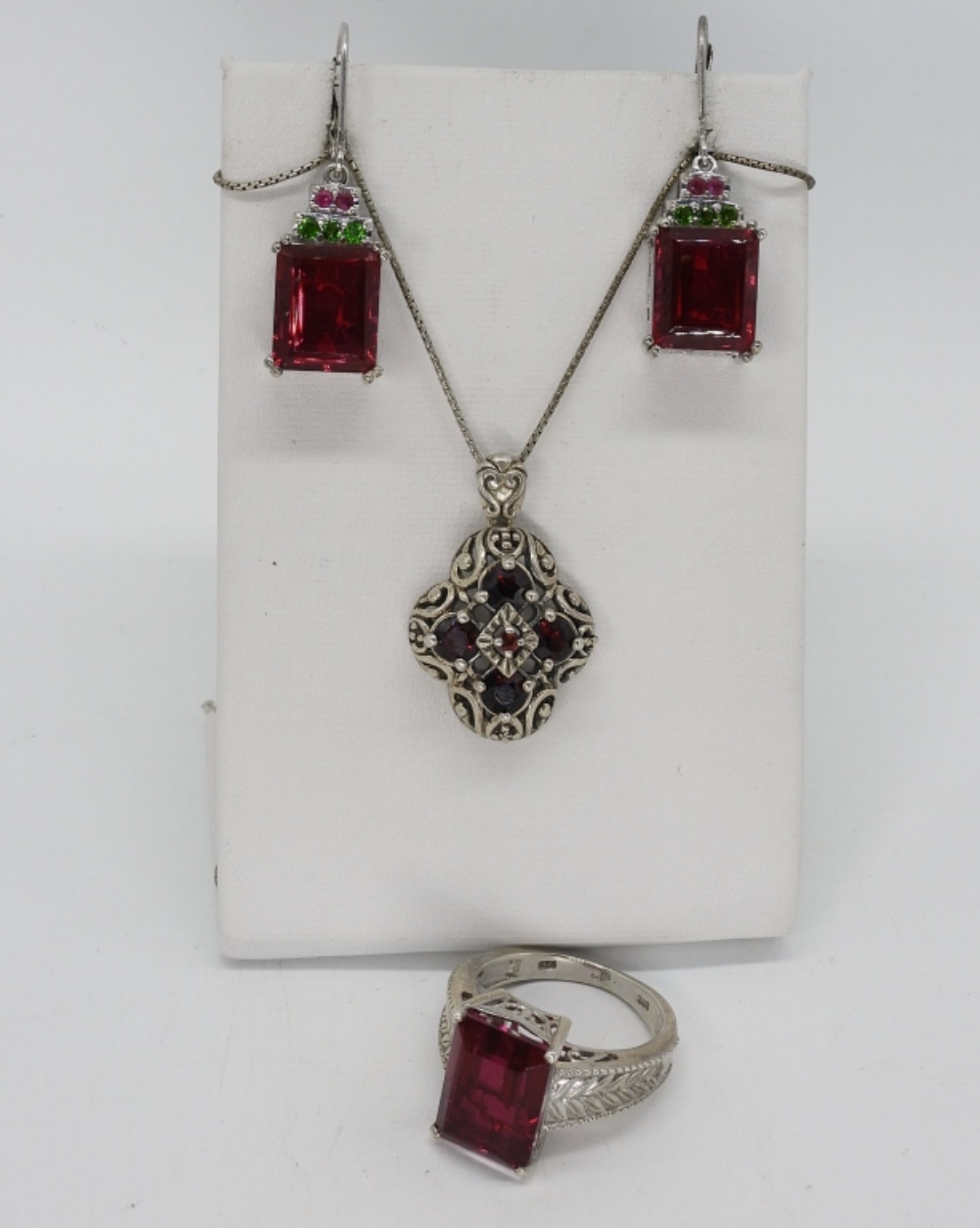 Gorgeous simulated ruby, sterling necklace and earring set. Ring is size 8. Matching earrings hang 1.5″ long. Garnet sterling necklace, 24″ long. (13 dwt)