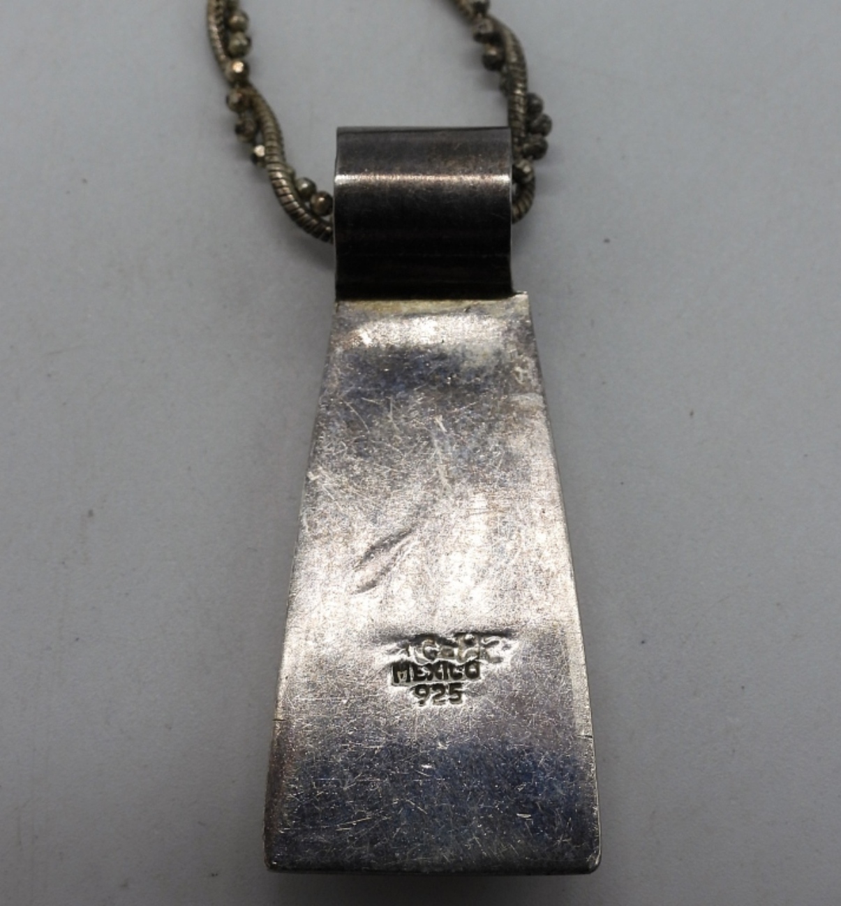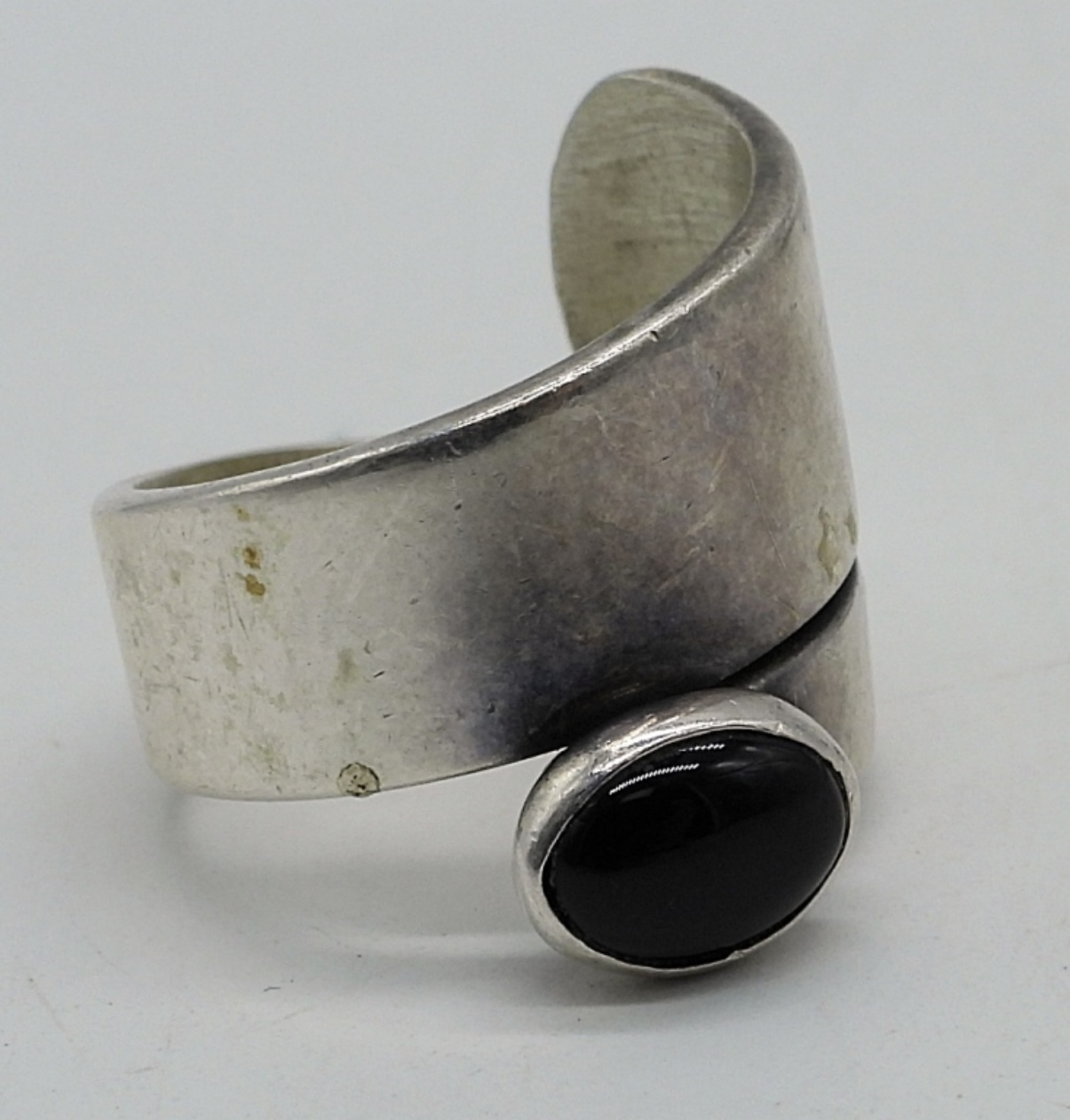 Taxco Mexico sterling black onyx pendant (1 3/4″) on a 18″ sterling chain. Black onyx sterling ring, size 5. (20 dwt)