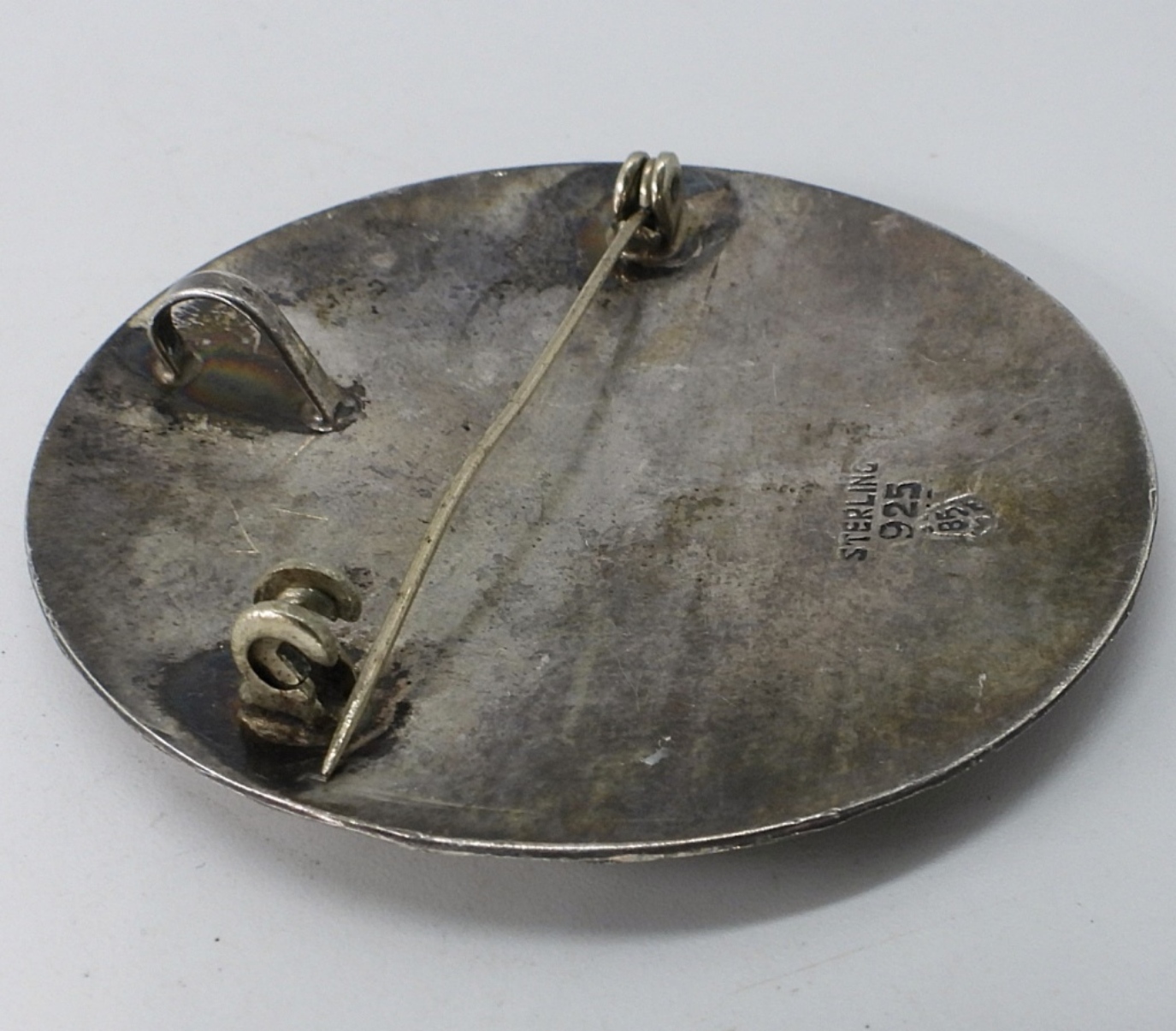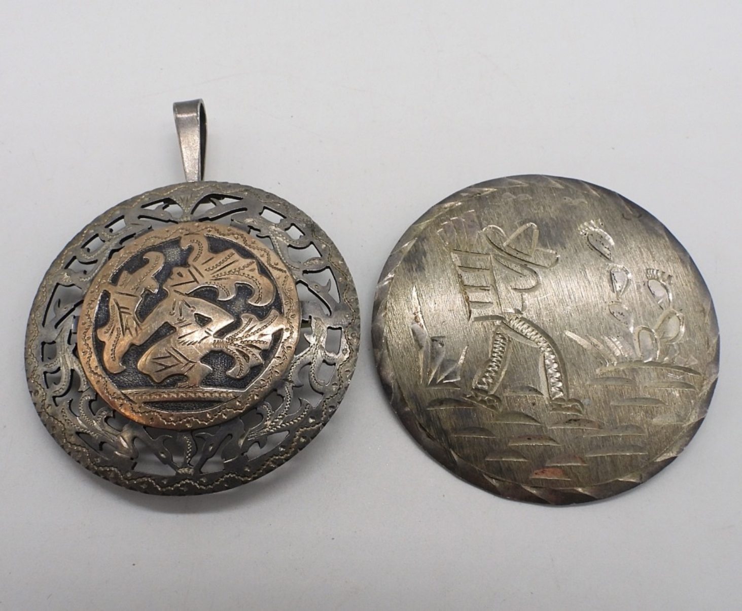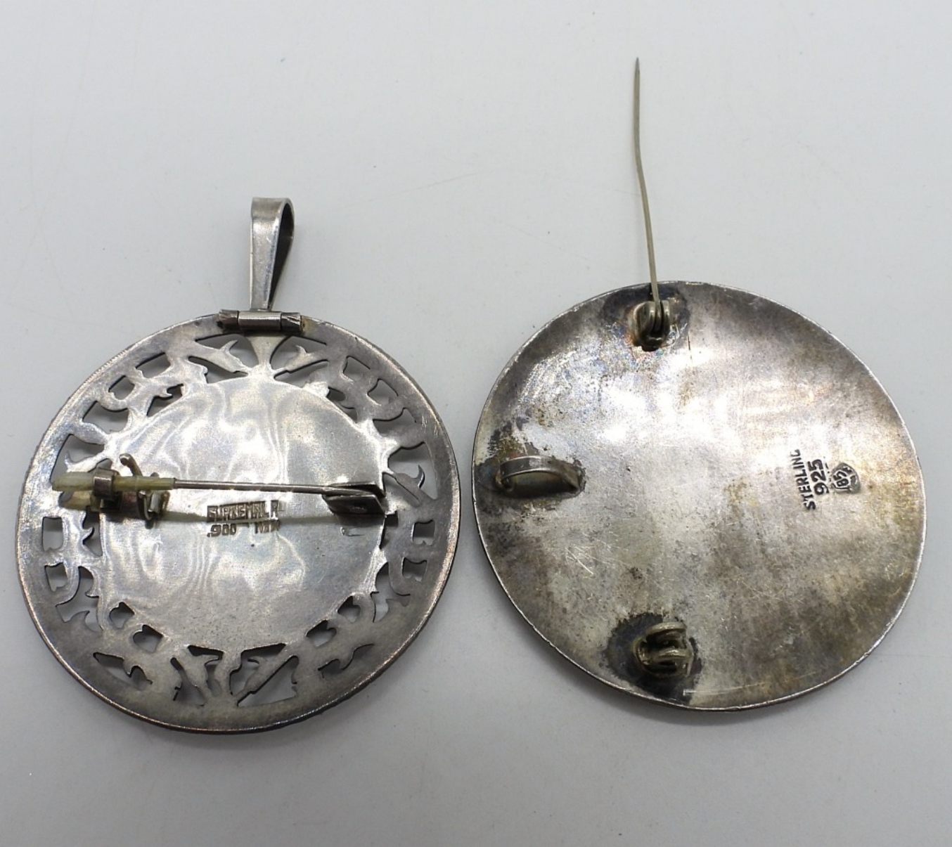 Two vintage sterling brooch / pendants. Marked “Guatemala 900 MTK” and “Sterling 925”. Both are 2″, etched design has a broken pin clasp. (16.5 dwt)