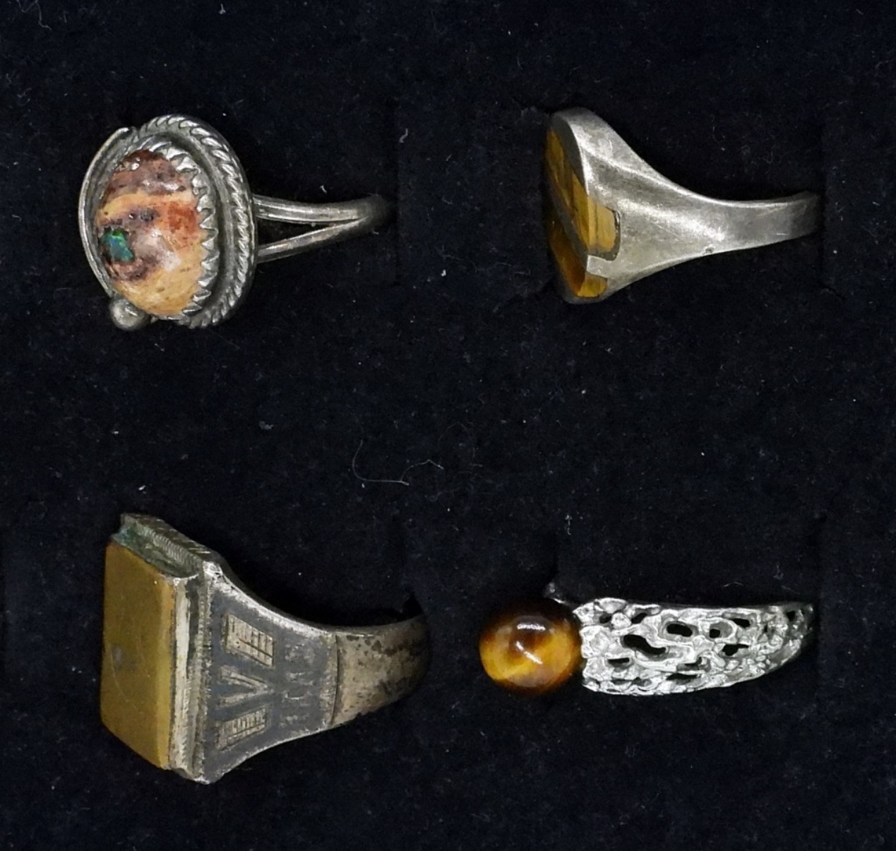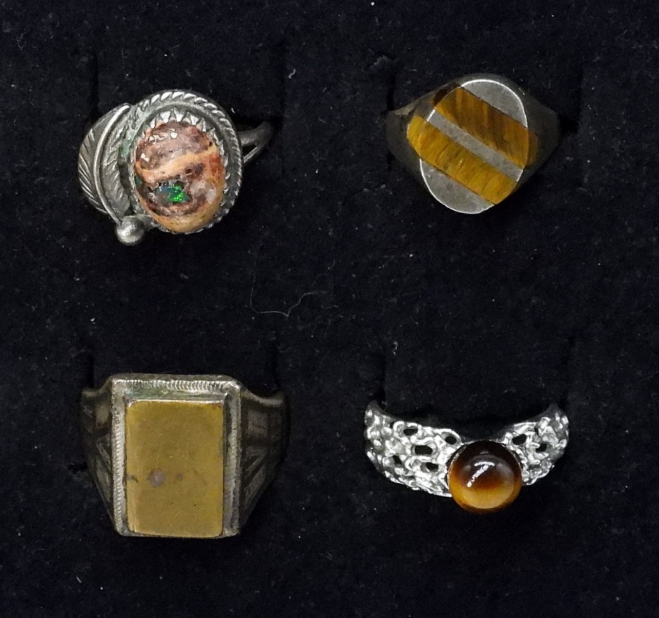 Four sterling rings, sizes 5, 6, 8.5. Mexican Fire Opal, Tigers eye & Unidentified. (12 dwt)