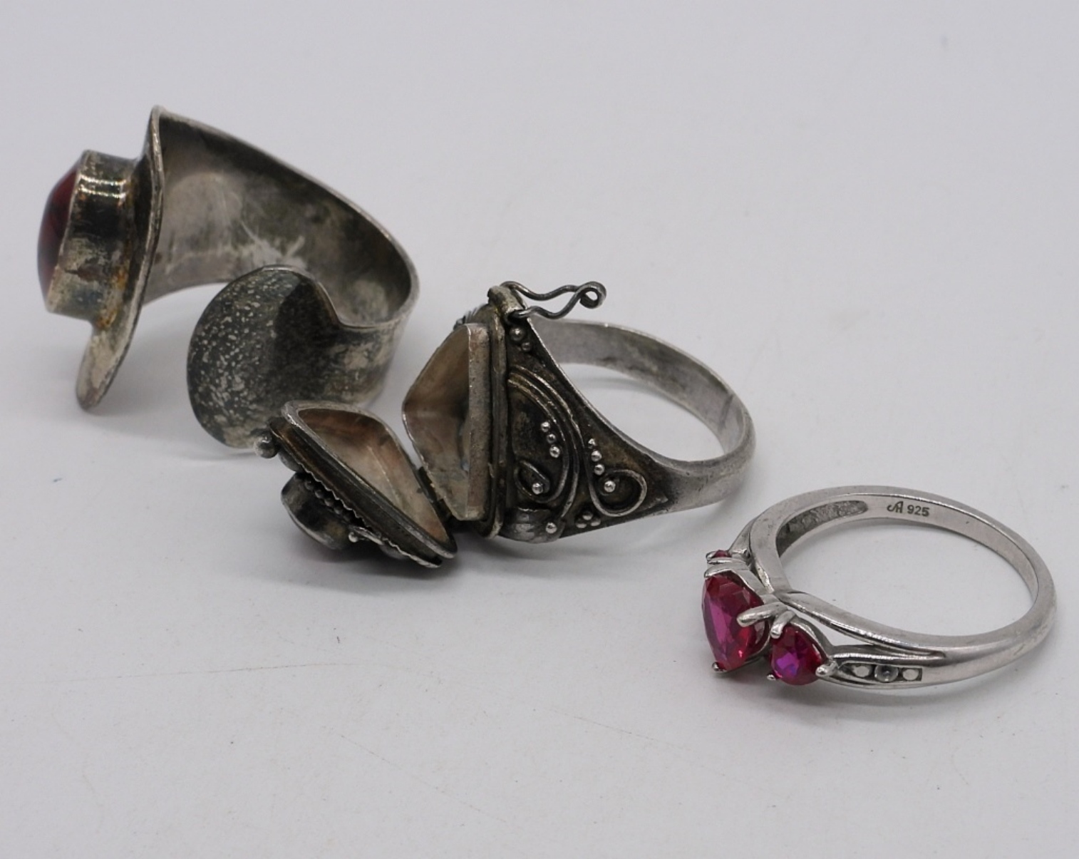 Three sterling rings, vintage red jasper, adjustable size. Garnet poison ring, size 8. Simulated ruby heart ring, size 7. (11.7 dwt)