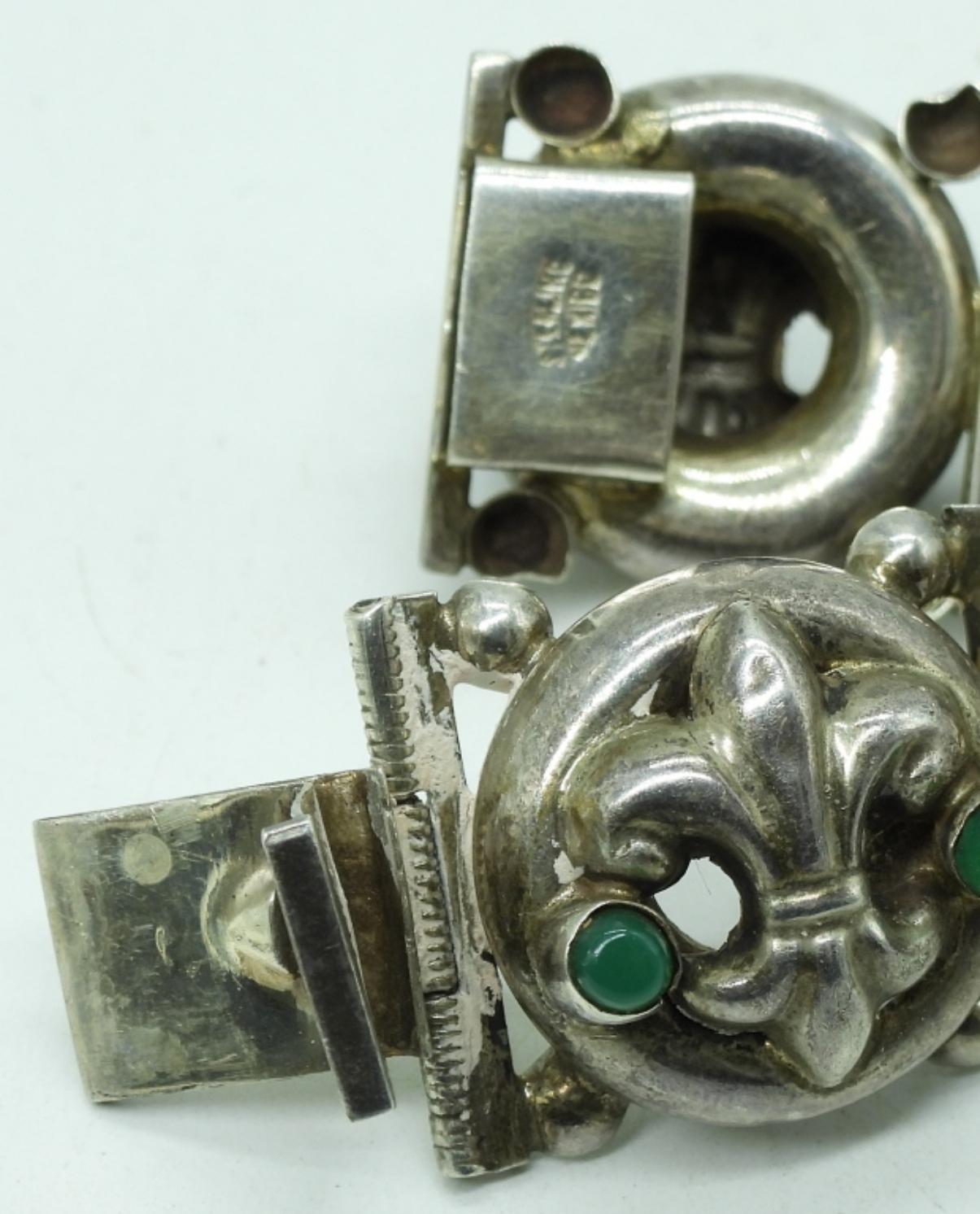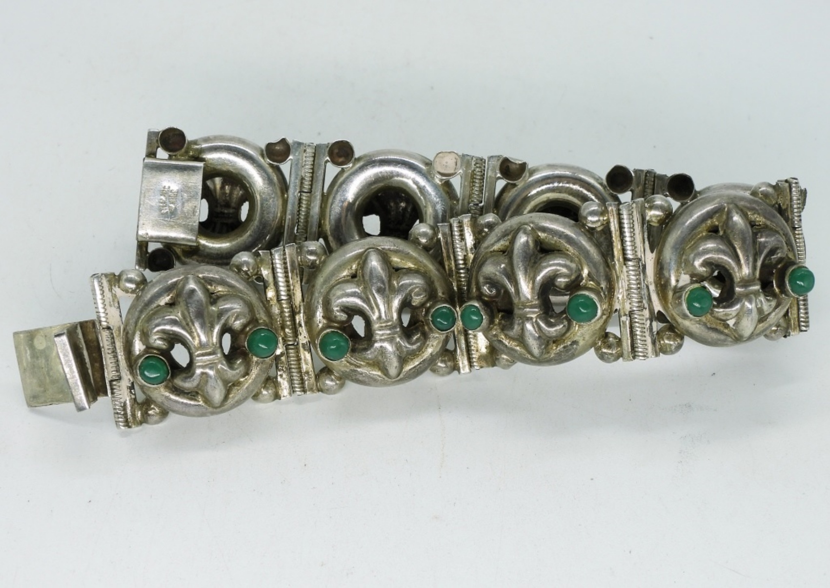 Mexico 925 bracelet with Fleur de Lis bracelet with green gemstones, 7.5″ long. (25.7 dwt)