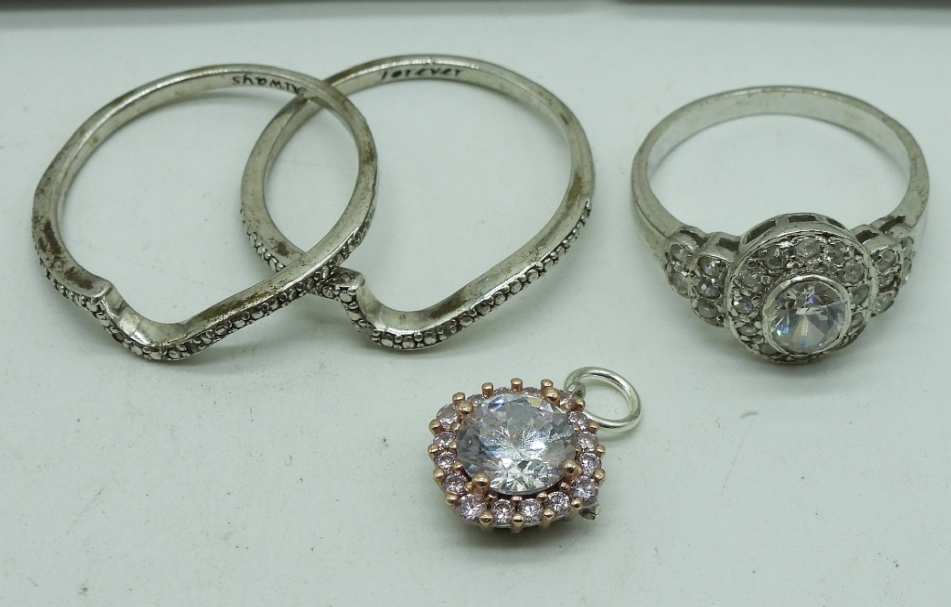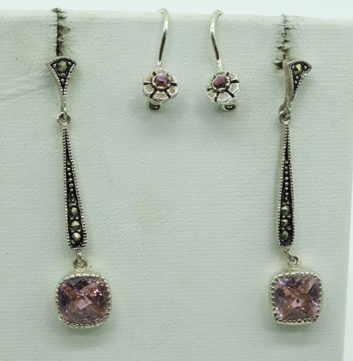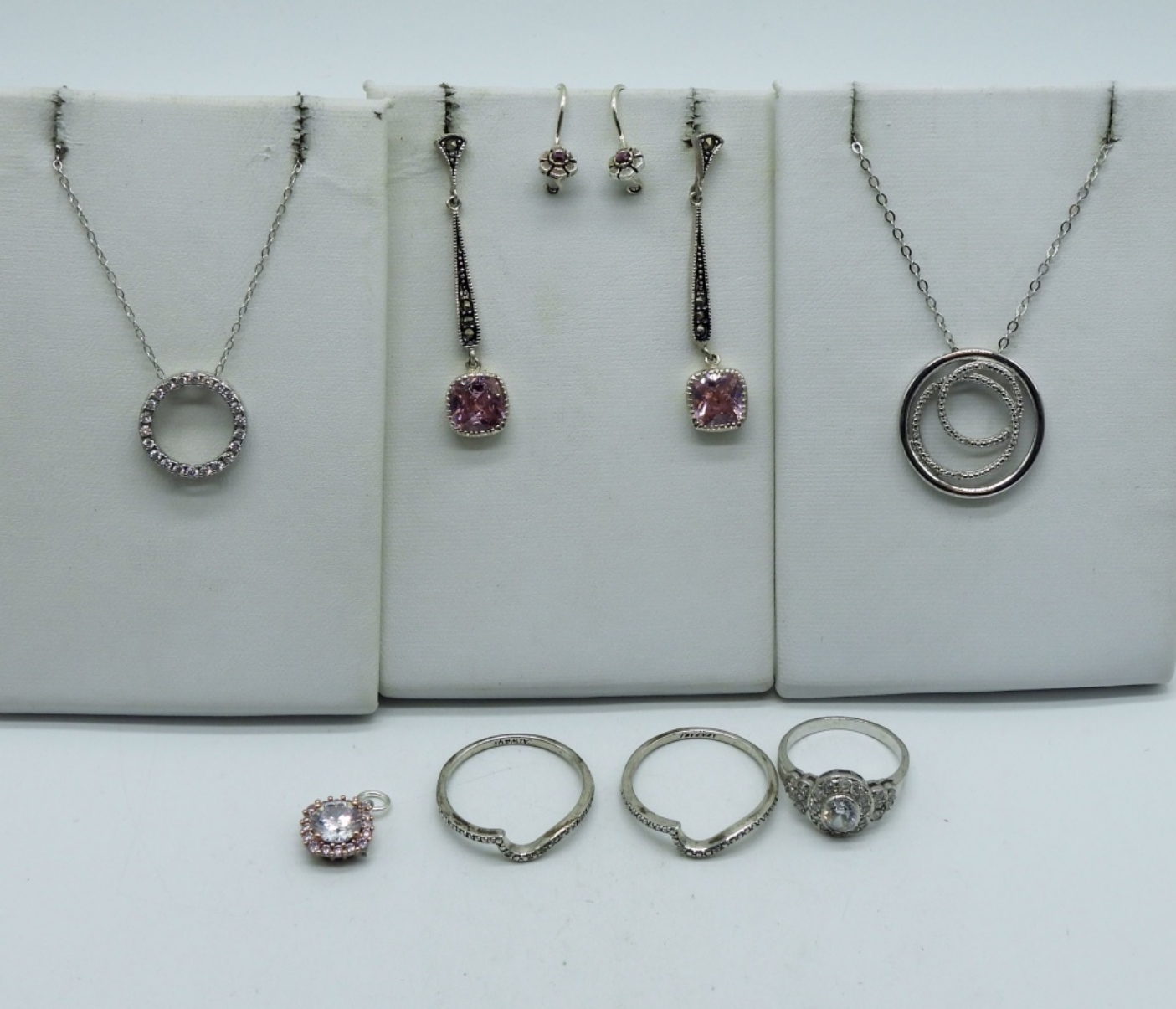 Two sterling necklaces with white gemstones, 18″ long. Three sterling rings, sizes 5.5 & 9. Two pair of sterling pierced earrings, 2″ long and 1/2″ long. Pink and white gemstone pendant. (12 dwt)
