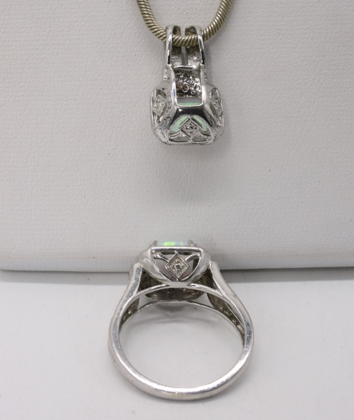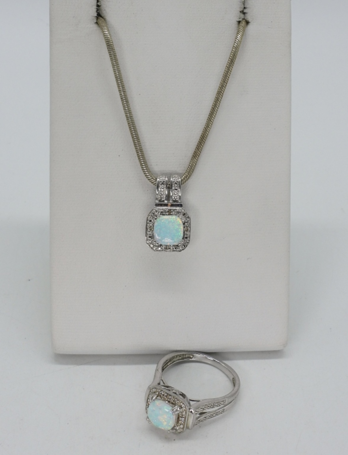 Matching sterling necklace and ring with opal gemstones. Necklace is 24″ long. Ring is size 7. (9 dwt)