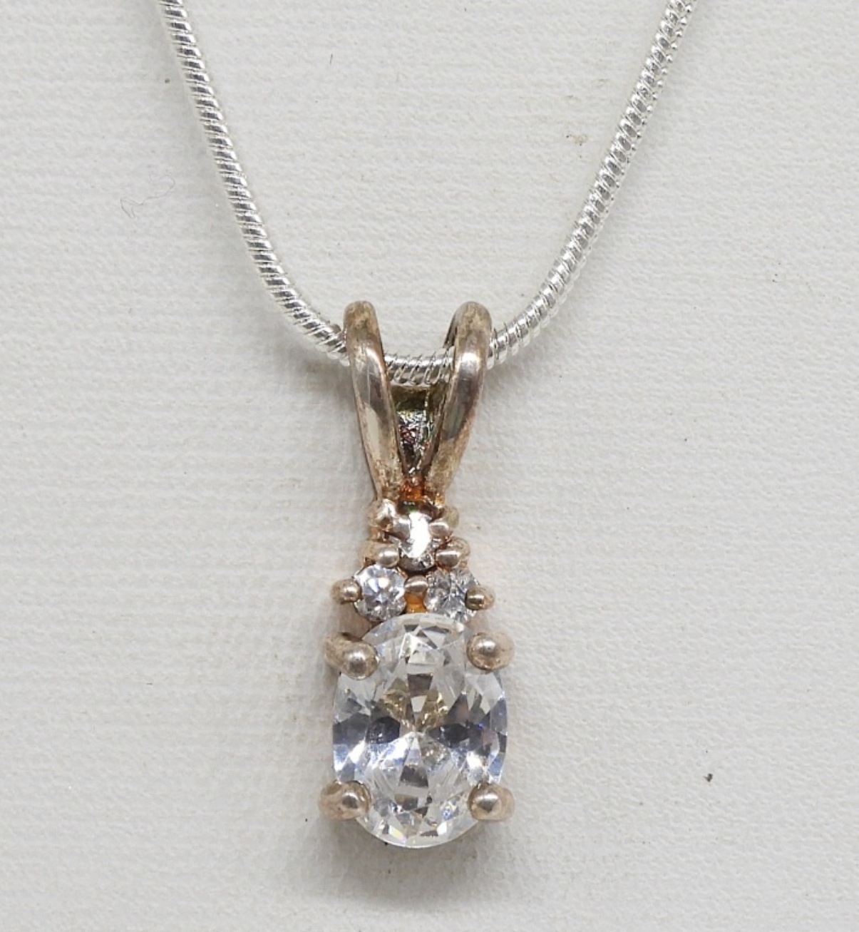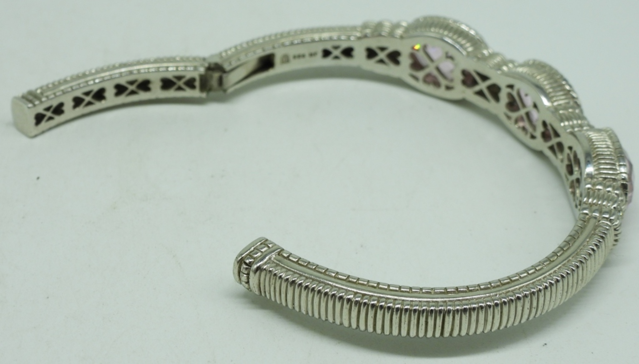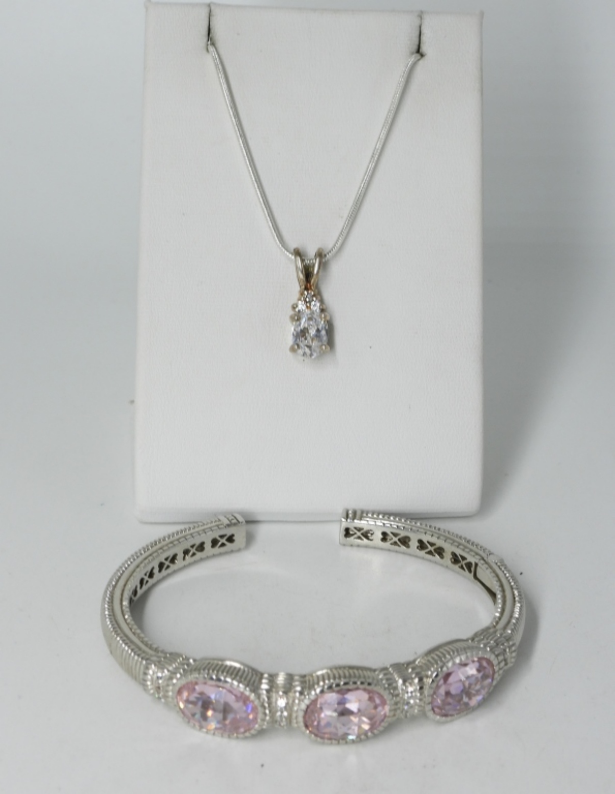 Sterling hinged cuff bracelet with pink glass or cz gemstones. Sterling necklace with pretty simulated diamond gemstone, 24″ long chain. (20.2 dwt)