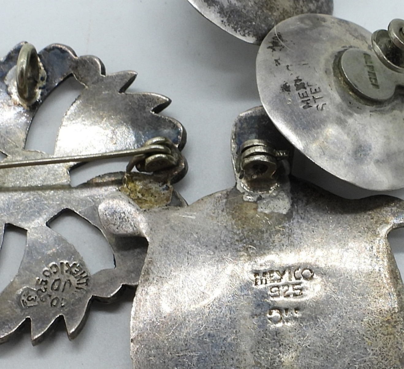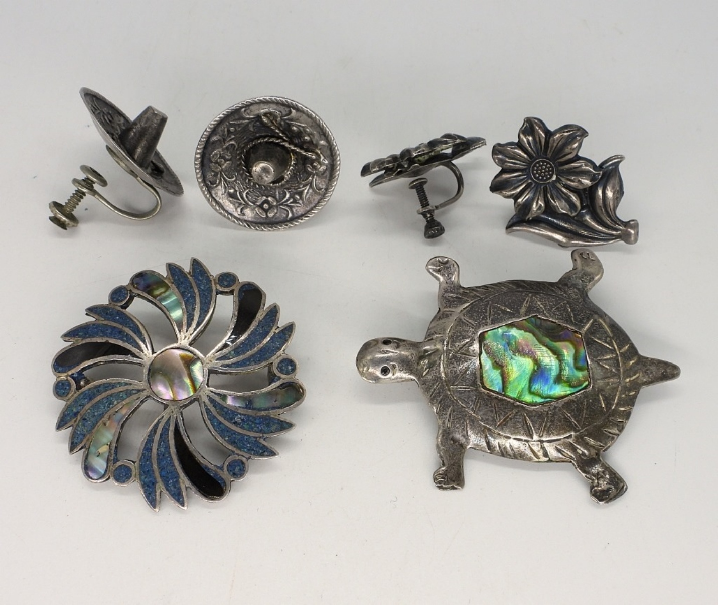 Vintage sterling earrings and pins. Two pair of Mexico sterling screw back earrings. Two sterling brooches, turtle measures 2″. Taxco round pin measures 1.5″. (16.4 dwt)