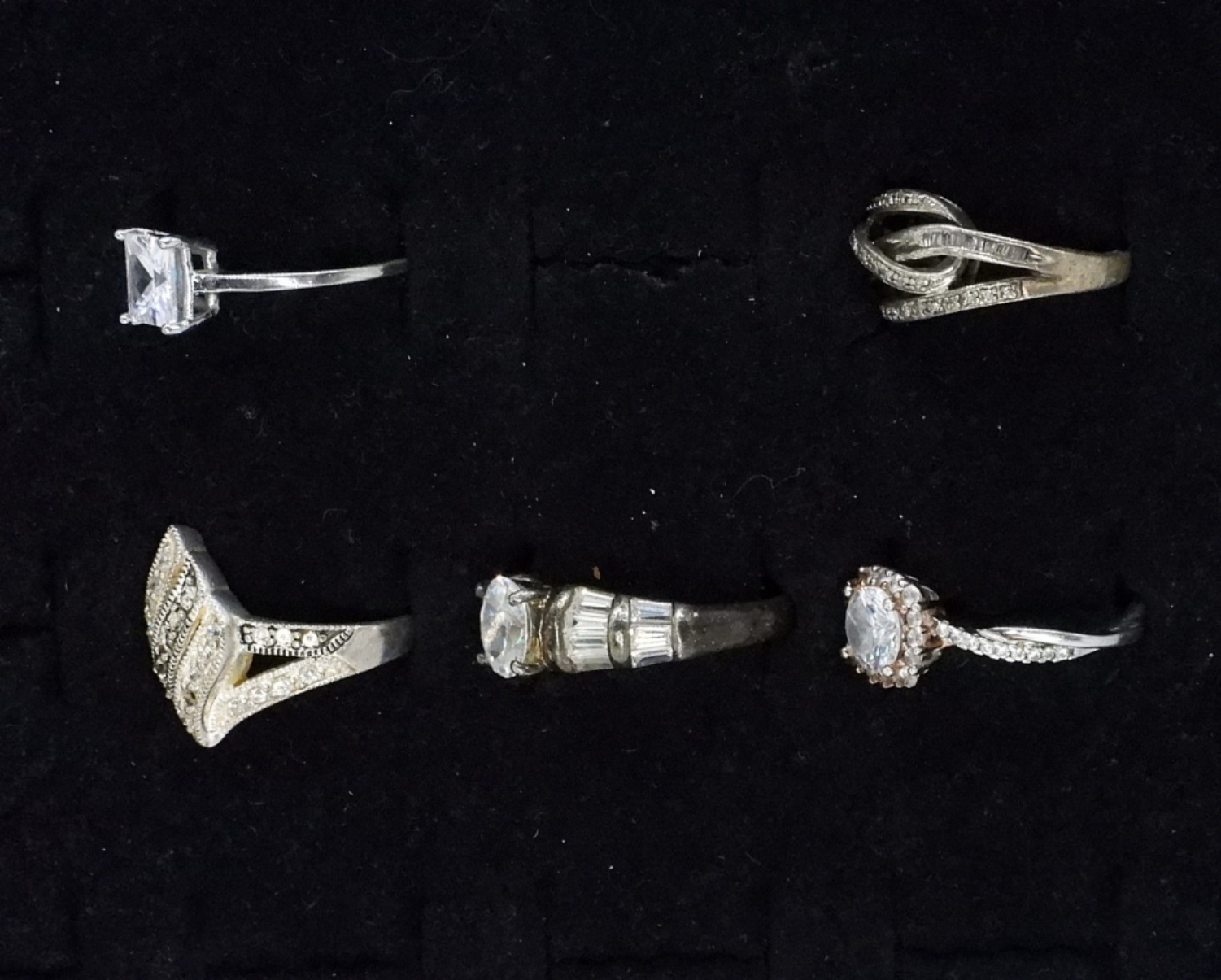 Five bridal style sterling rings, sizes 5.5-10 (11 dwt)
