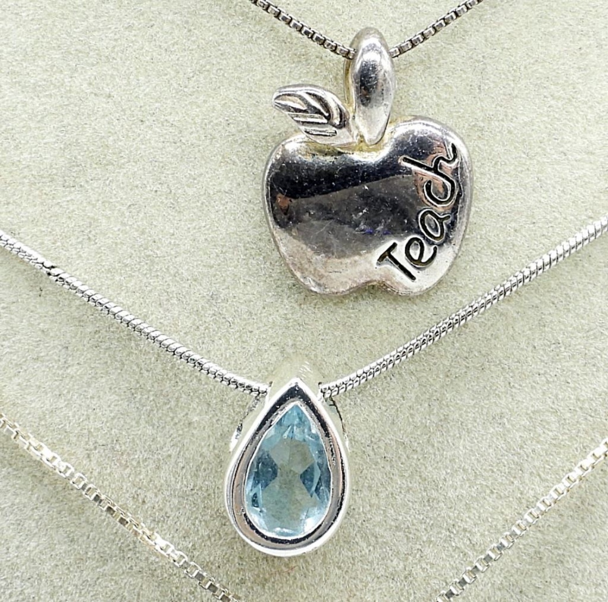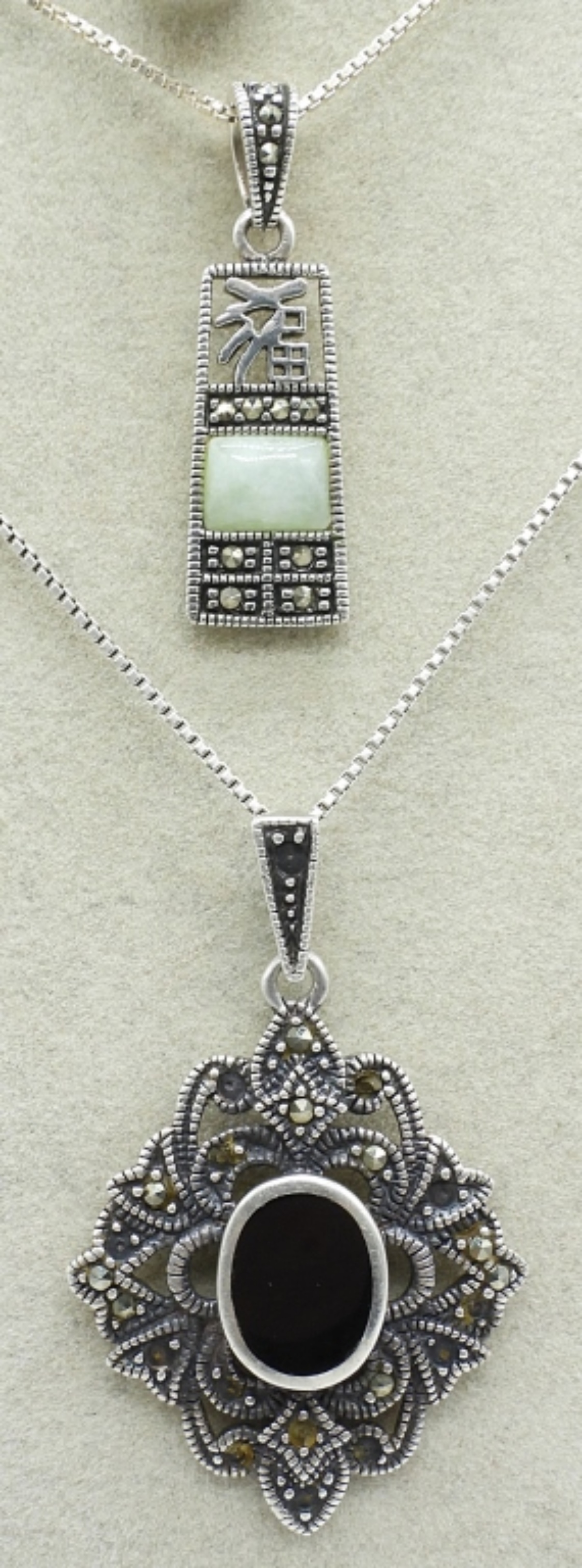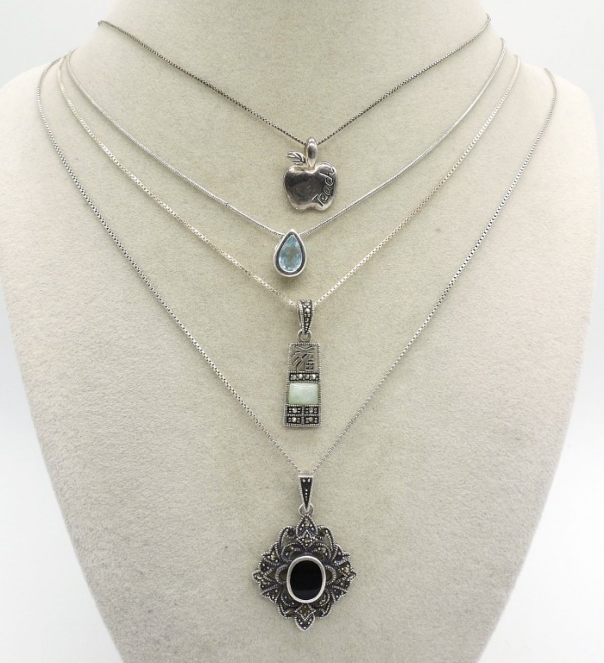 Four sterling gemstone necklaces. Jade, Black Onyx & Blue Topaz. Chains are 18-20″ long. (11.6 dwt)