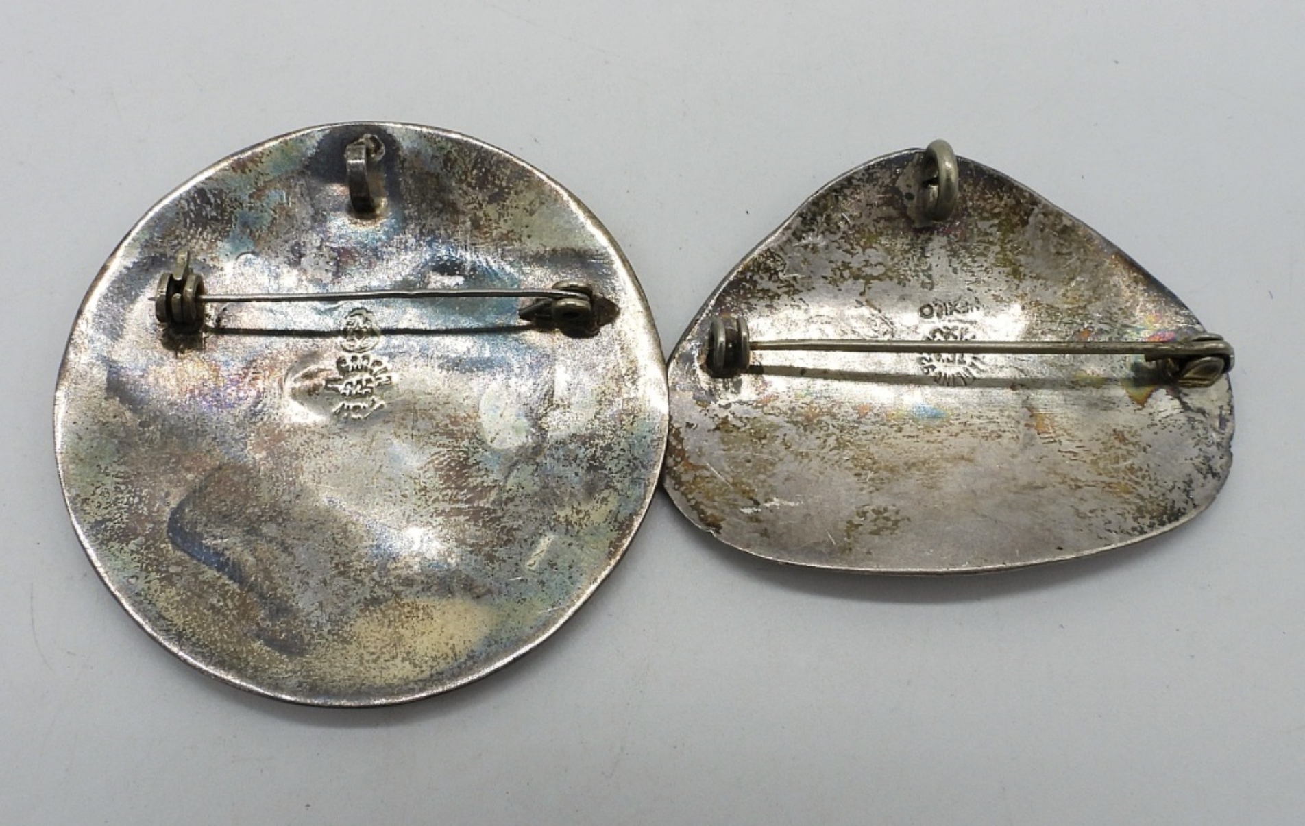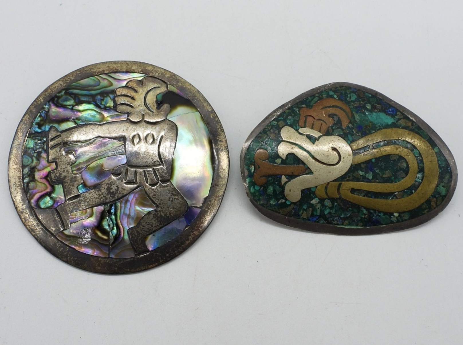Two sterling vintage brooches. Turquoise and Abalone inlay. Both brooches are also pendants. 2″ wide. (16.2 dwt)