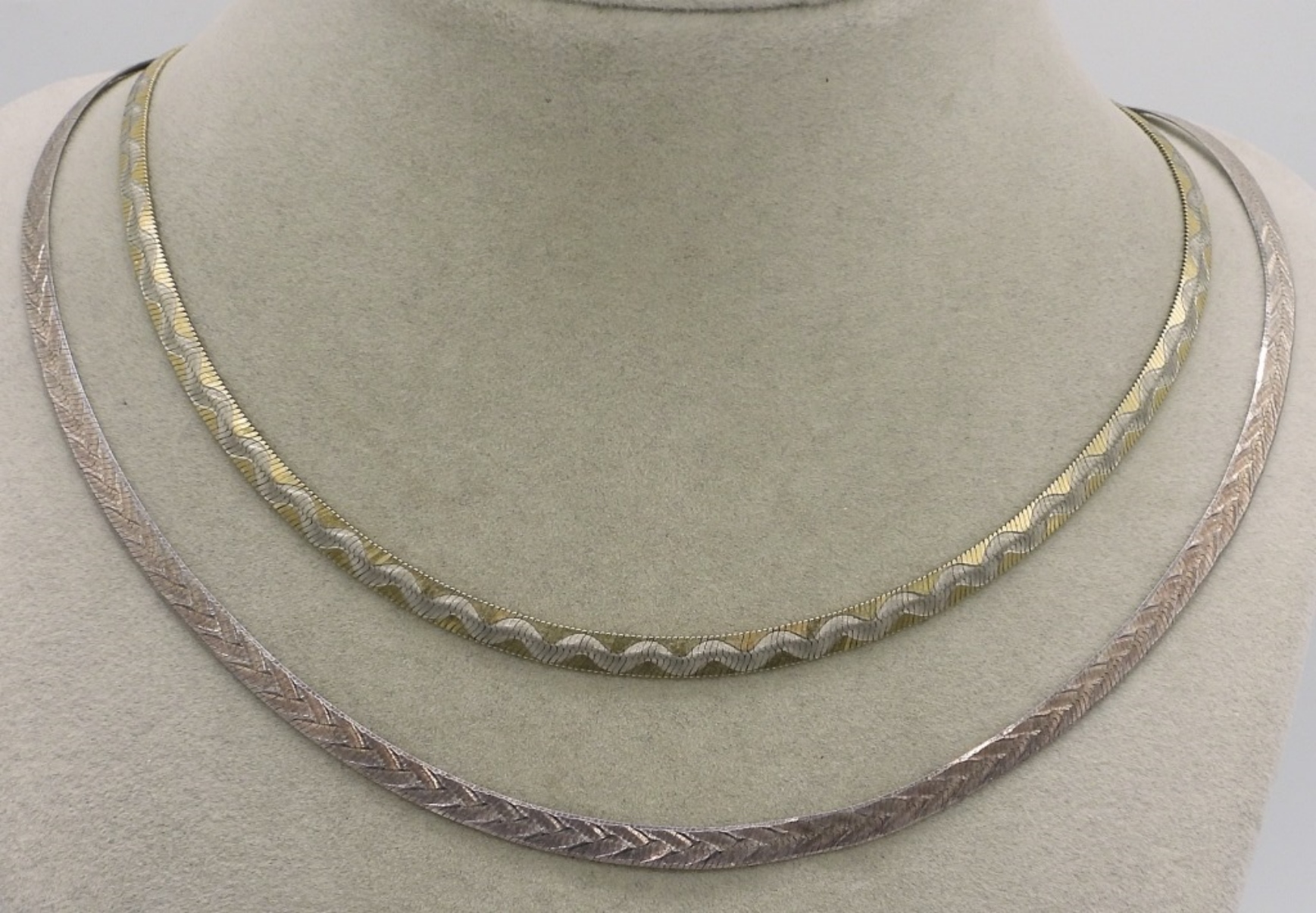 Two sterling and gold tone herringbone necklaces, 18″ long. (12.6 dwt)