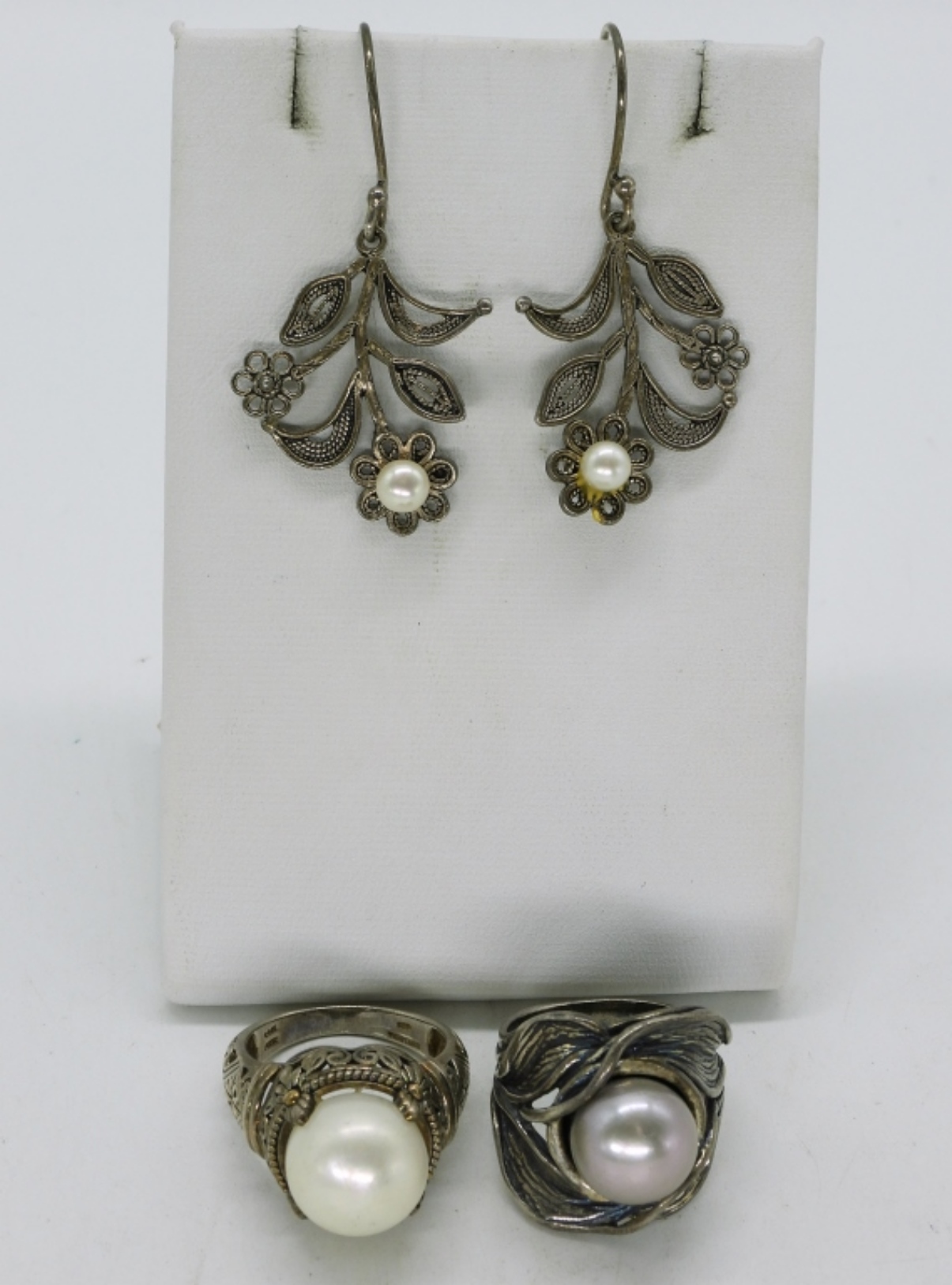 Two pair of sterling pearl rings, size 7. One pair of sterling pearl, pierced earrings, 2″ long. (14 dwt)
