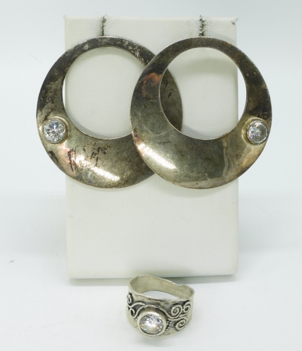 Large sterling, round pierced earrings with simulated diamond gemstones. Matching ring, size 9. (17.3 dwt)