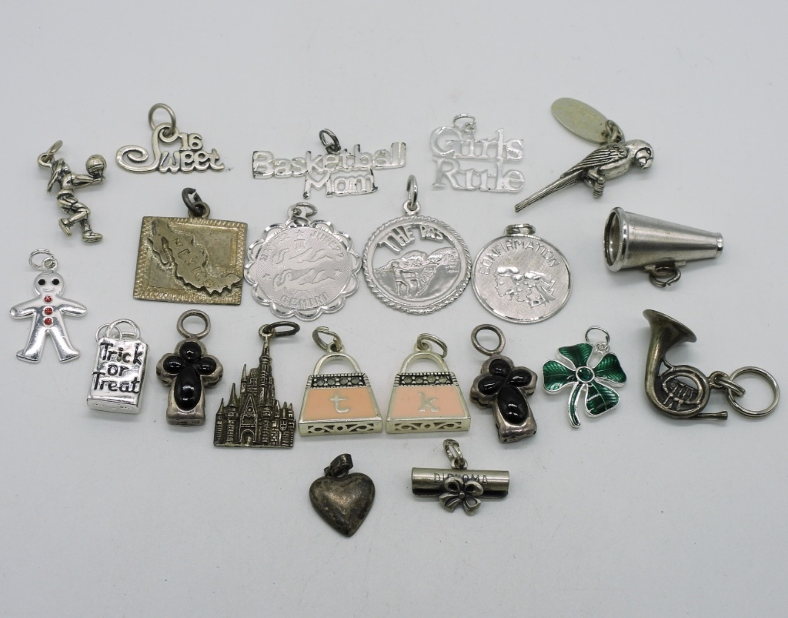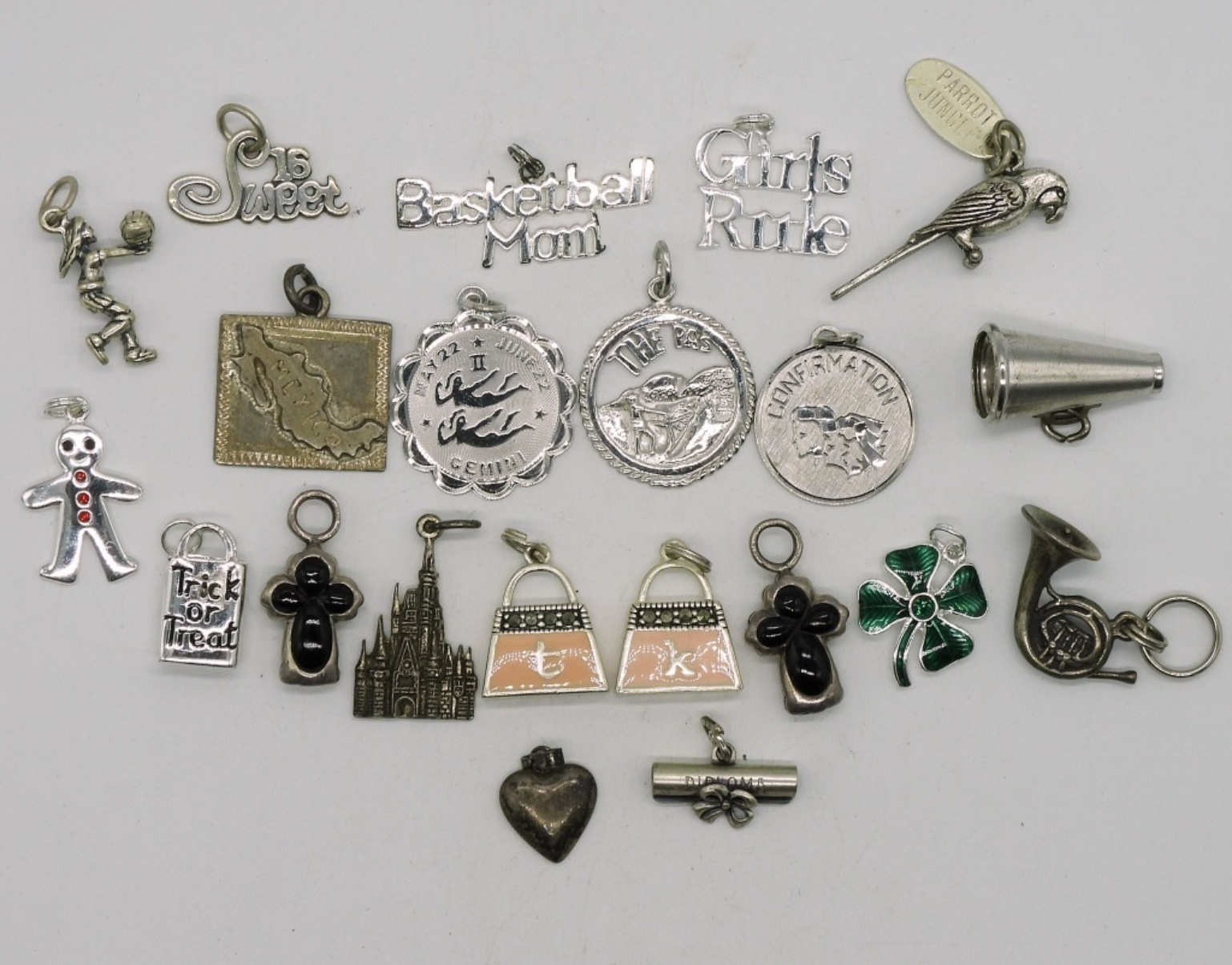21 Sterling Charms for bracelets, Disney, Religious, Holiday, Sports and more. (31 dwt)